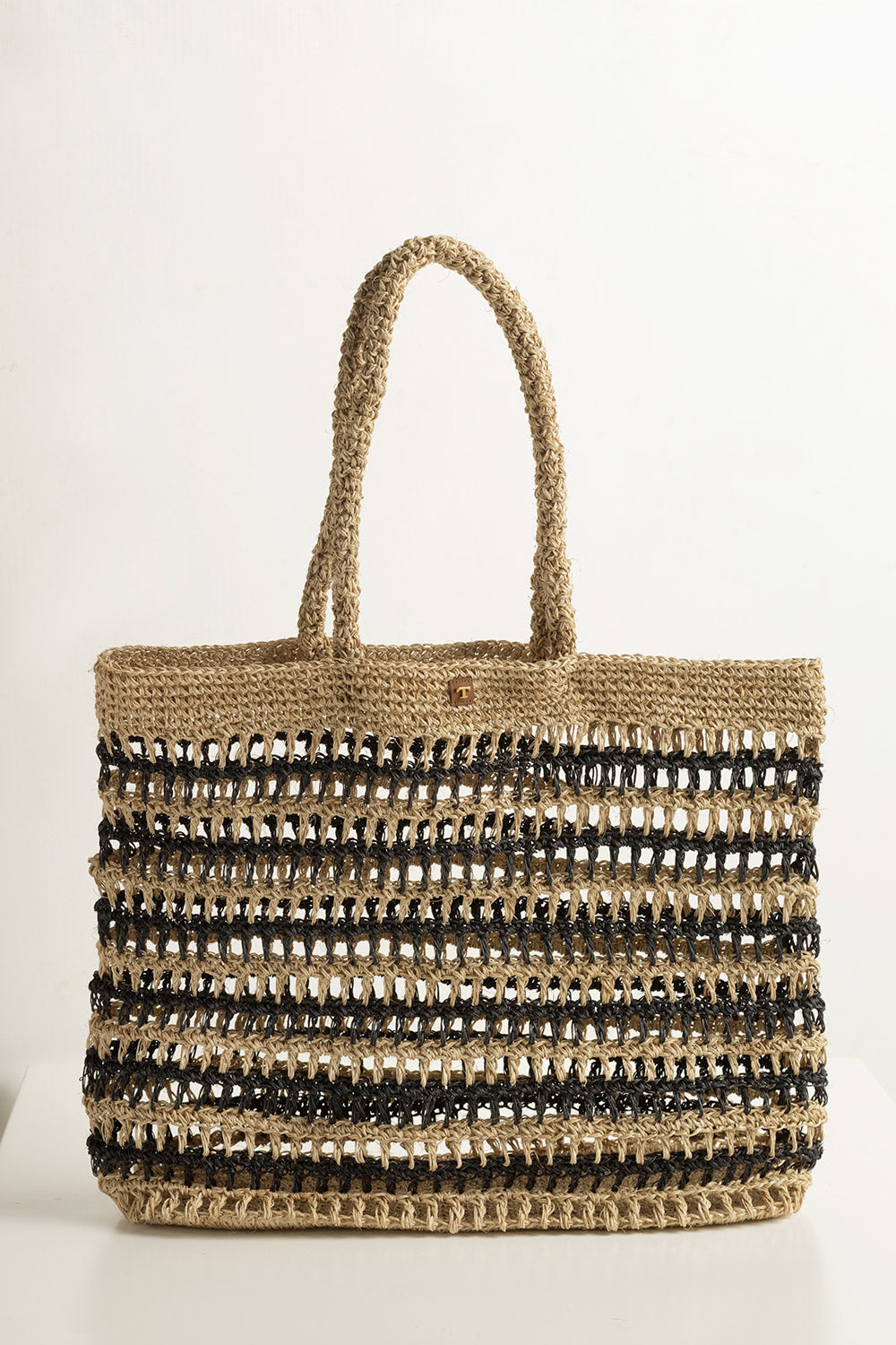 Bolso grande tejido a mano en fique natural, con rayas de color negro; asas tejidas para llevar al hombro y dije en cuero con "T" en baño de oro, característico de nuestra marca. Color negro/natural, Ref. 0S42061