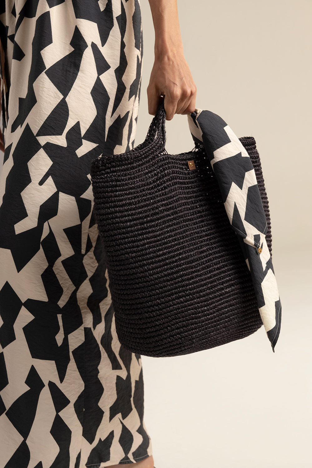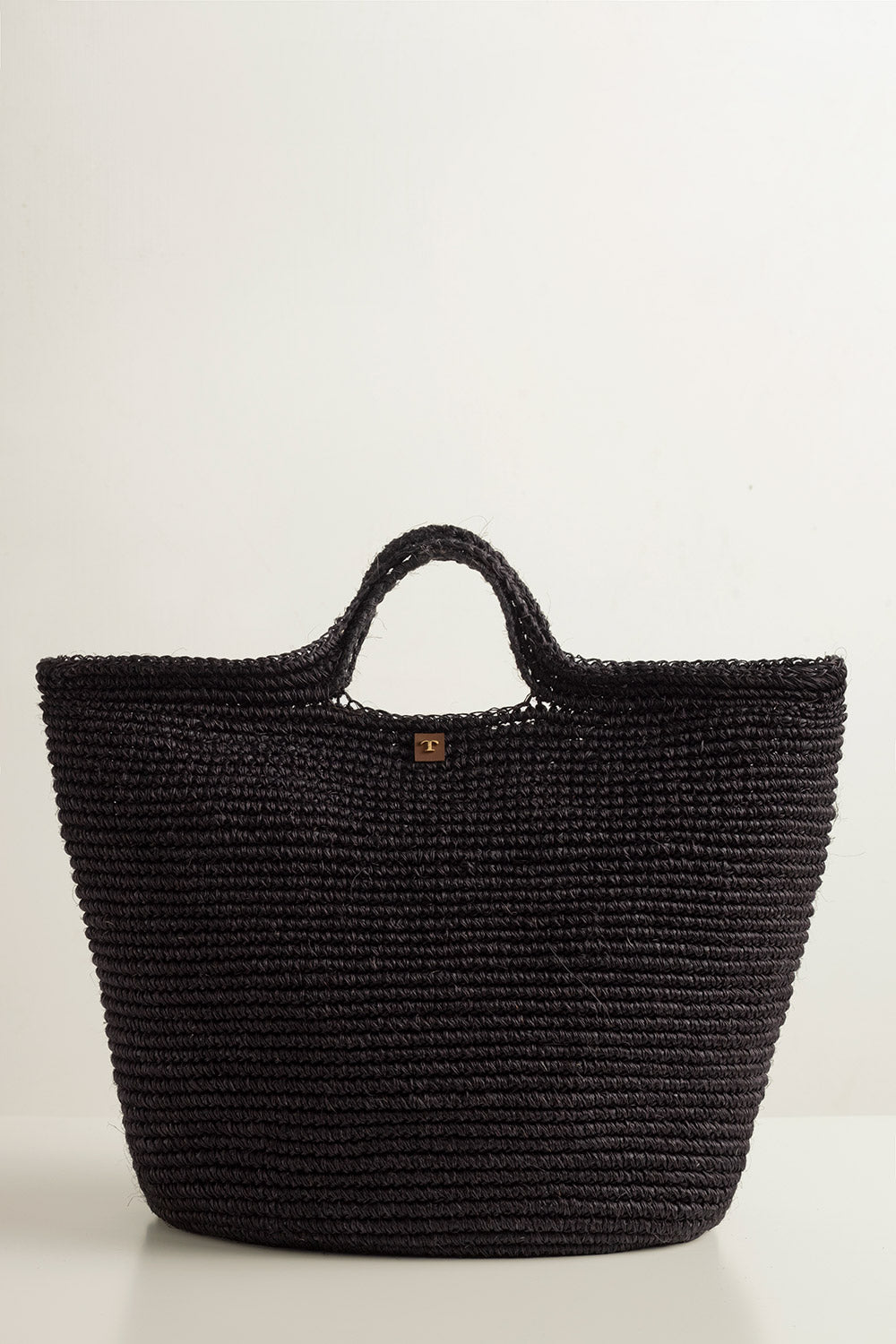 Bolso grande tejido a mano en fique natural color negro, con asas tejidas para llevar en la muñeca; cargadera interna en cuero, removible, para llevar al hombro; dije en cuero con "T" en baño de oro, característico de nuestra marca. Color negro, Ref. 0S43N61