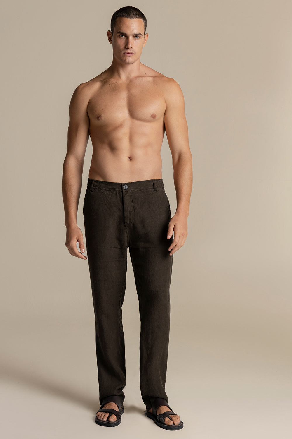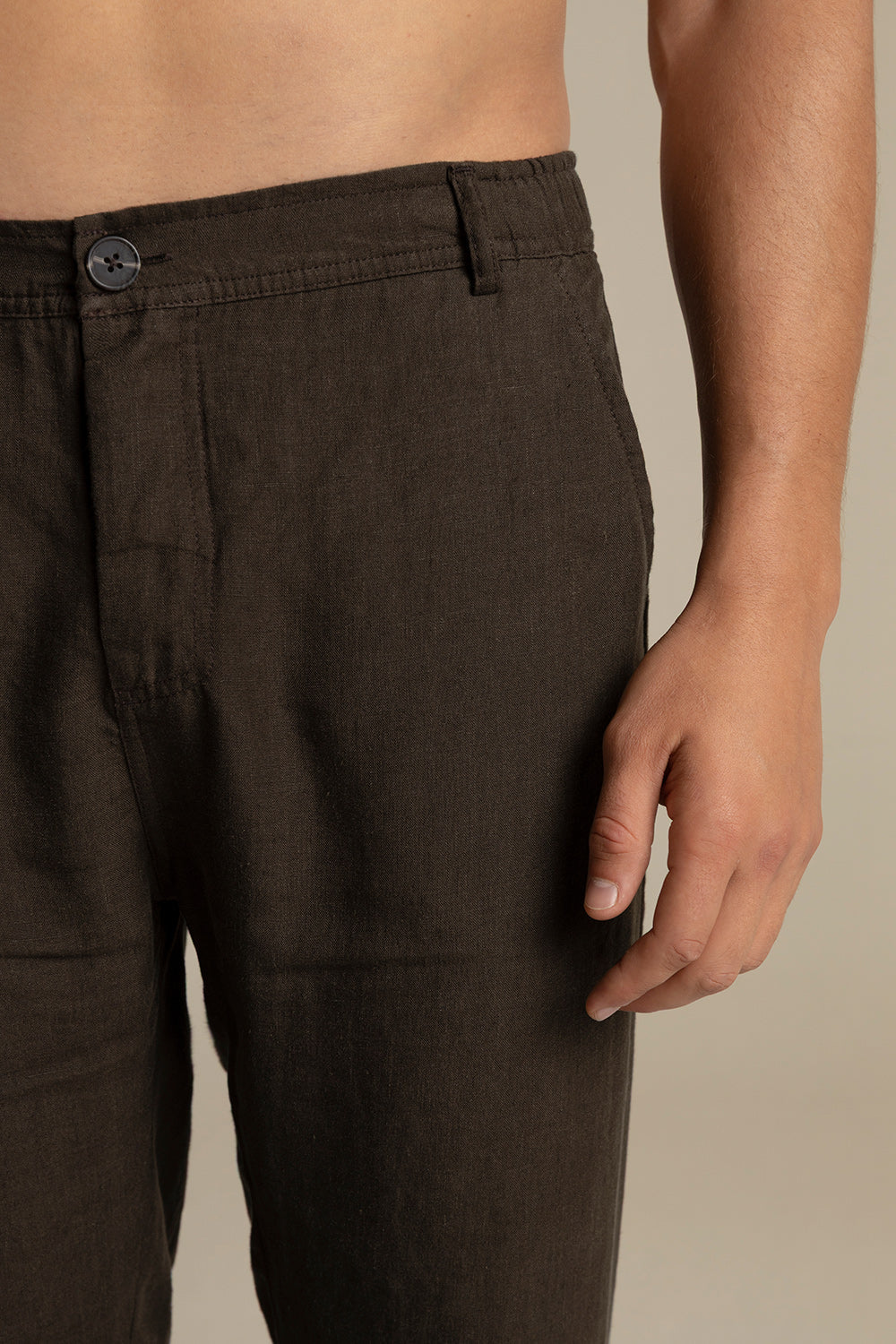 Pantalón en lino café. Classic fit, cintura enresortada, botón para cierre en cintura, bolsillos laterales y bolsillos de parche traseros. Color café oscuro, Ref. PH67C61