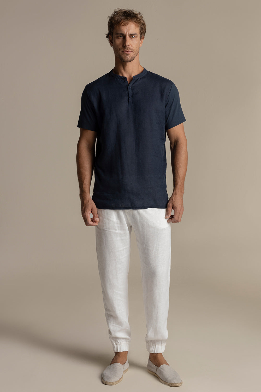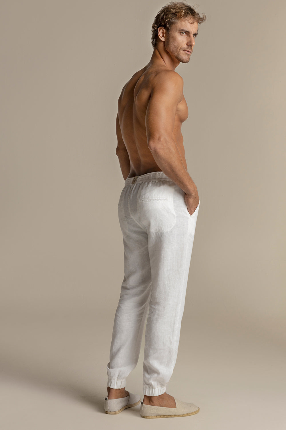 Pantalón jogger duna en lino, silueta relajada, cintura enresortada, pasadores, botón para ajuste en cintura, bolsillos laterales y bolsillos de ribete traseros. Color blanco, Ref. PH16B21