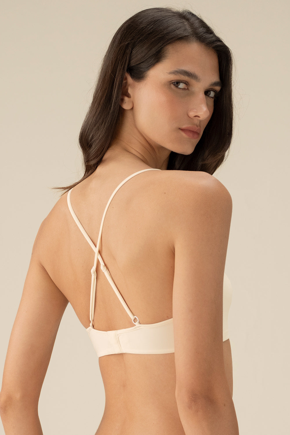Brasier tipo top elaborado en microfibra con tacto frío, delantero con tela doble para mayor soporte y menor transparencia, cargaderas cruzadas ajustables. Color marfil, Ref. 0468052