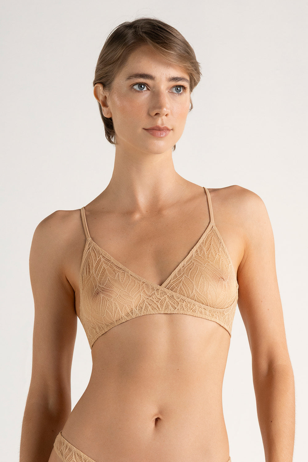 Brasier triangular sin copa de espuma ni aro, elaborado en encaje semitransparente, cargaderas ajustables y abrochadura en espalda. Color piel, Ref. 2417P61