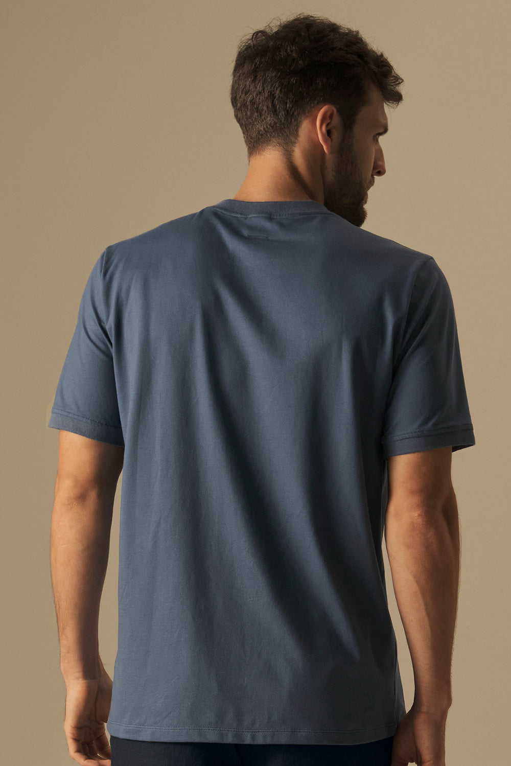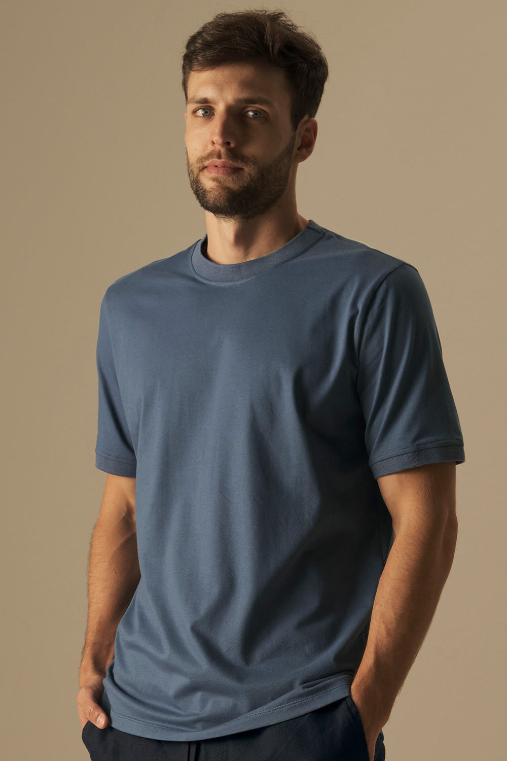 Camiseta en algodón tejido pique azul, manga corta silueta oversized, con puños y cuello en tejido rectilíneo. Color azul, Ref. SH37A52