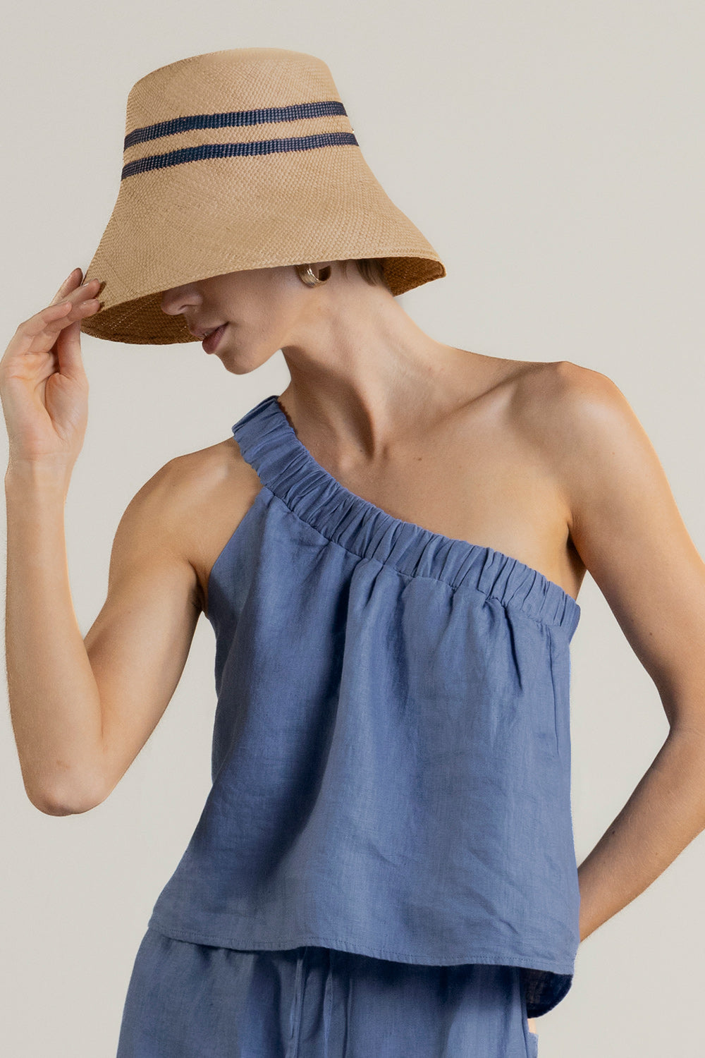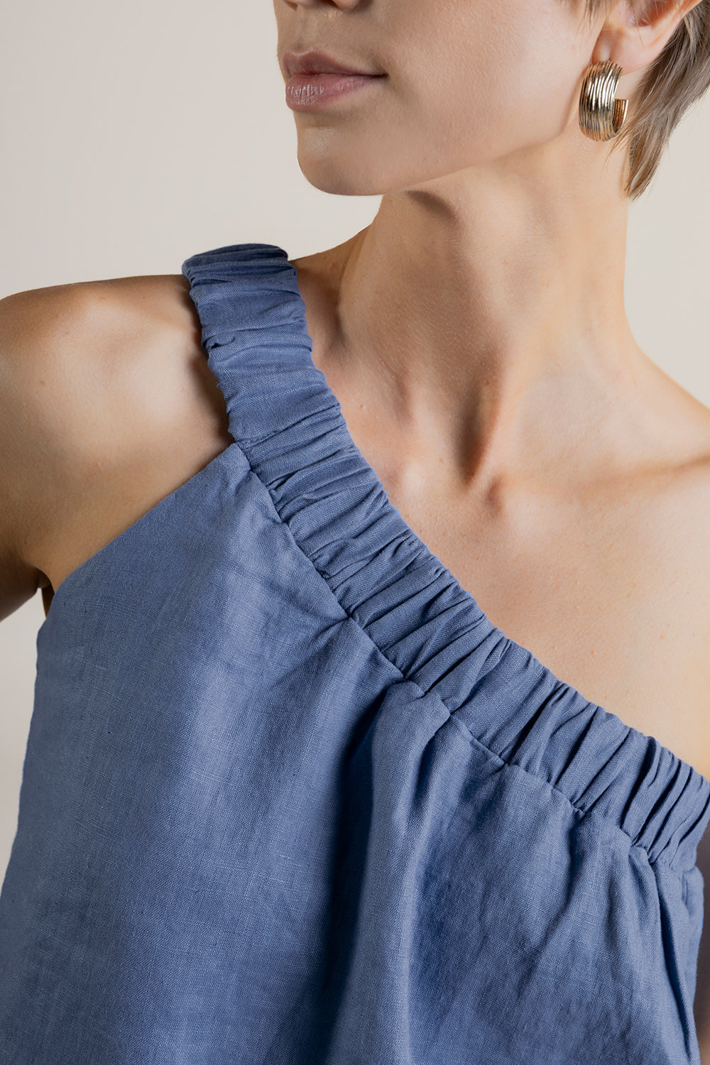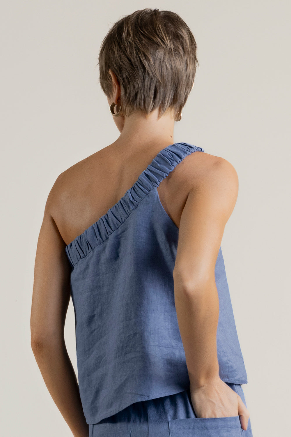 Top de un solo hombro en lino 100% color azul claro, elástico en escote, forro interno y detalle moneda con la "t" grabada en baño de oro, característica de nuestra marca para evitar oxidación. Color azul claro, Ref. 0A34A53
