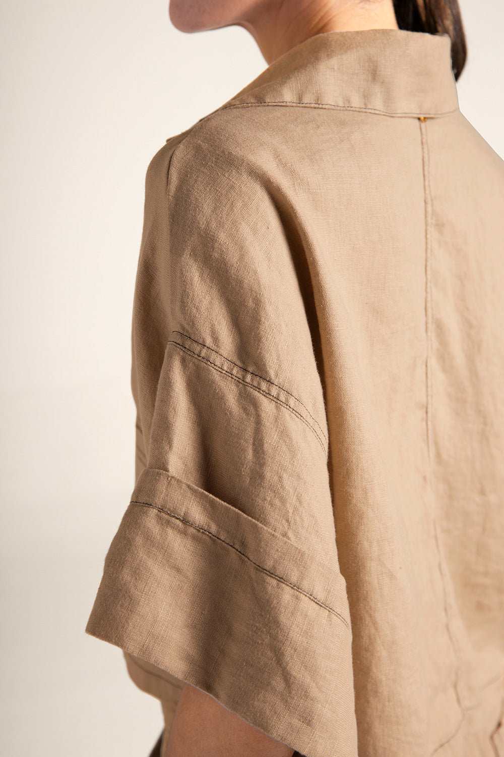 Chaqueta corta en lino con costuras negras en contraste, silueta amplia, mangas cortas con ruedo ancho, sistema de cierre en frente con broche interno, bolsillos de parche frontales y moneda en baño de oro grabada con la ''t'', como detalle distintivo de la marca. Color caqui, Ref. 0A16C62