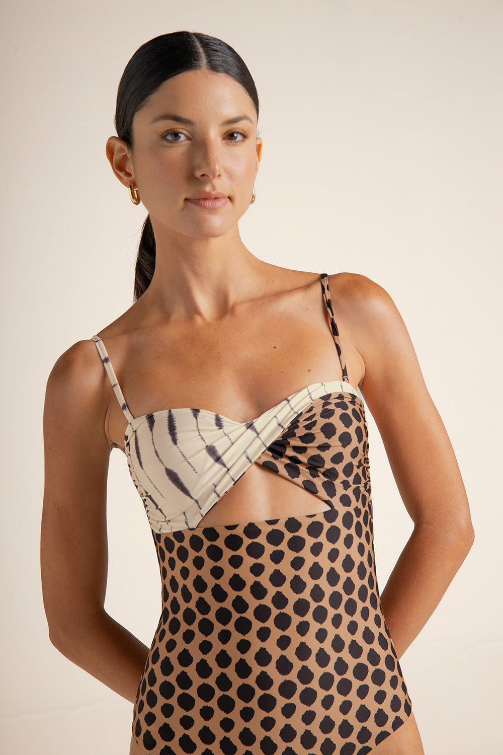 Entero bandeau en tela estampada de lunares con top entorchado en estampado mixto de lunares y líneas; tiras removibles para opción strapless o con tiras para amarrar y lograr un mejor ajuste, elástico de silicona interno en el escote de la espalda, accesorio con grabado ''touché'' en baño de oro; copas fijas y tela con protección uv. Color café / marfil / negro, Ref. 0E81062
