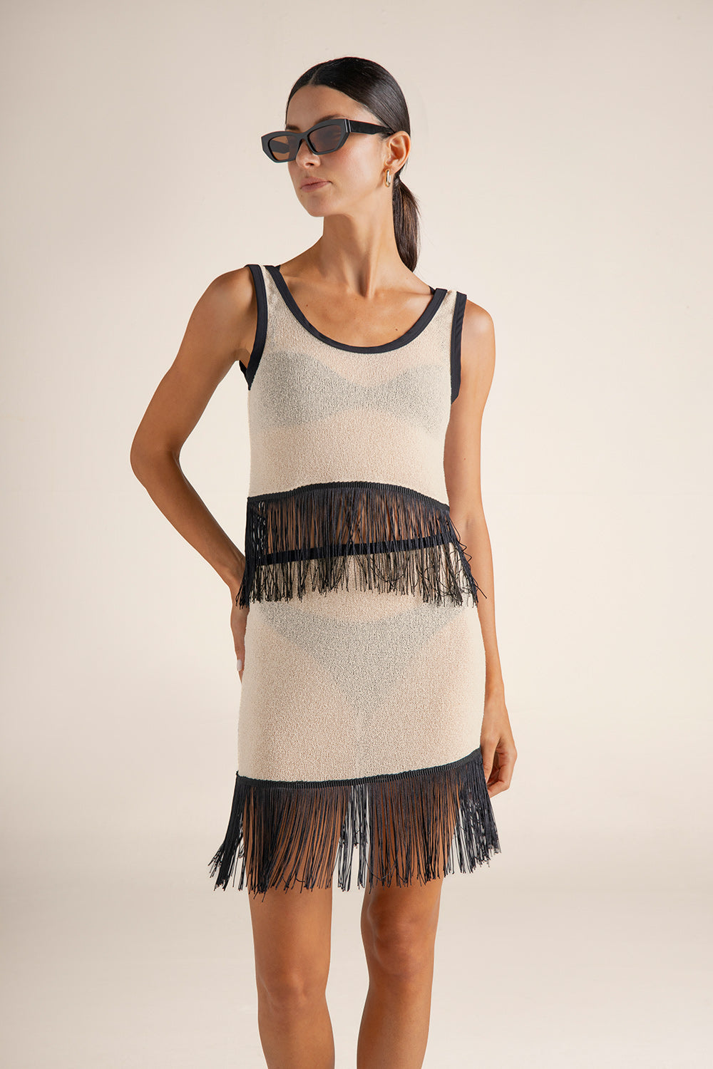 Top en tejido de punto abierto con sesgos y flecos en contraste, sin mangas, cuello redondo y moneda en baño de oro grabada con la ''t'', como detalle distintivo de la marca. Color marfil y negro, Ref. 0A57M62
