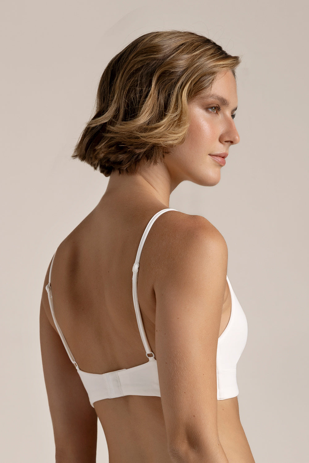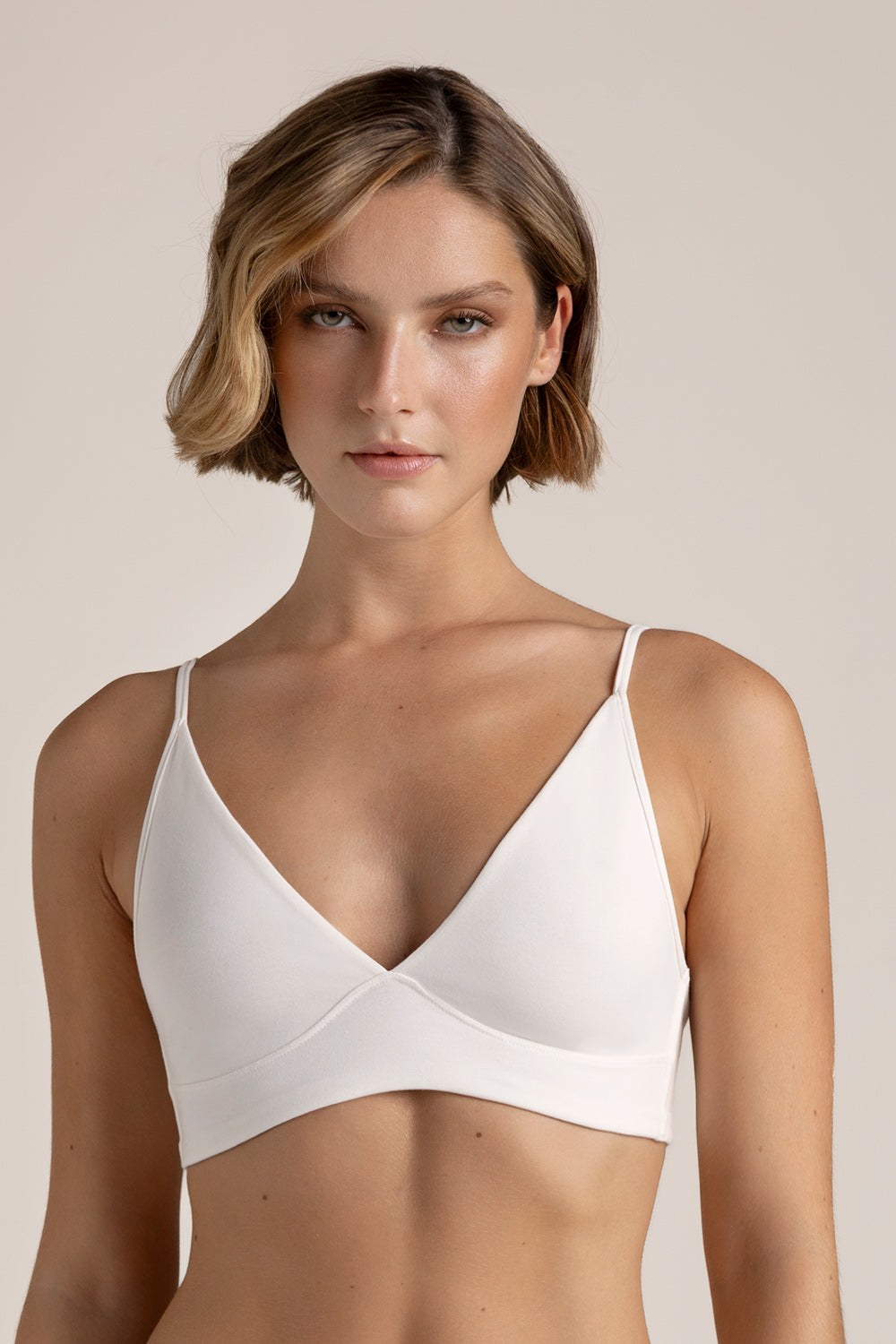 Brasier triangular sin copa de espuma ni aro, elaborado en mezcla de algodón, copas con tela doble para mayor soporte, cargaderas ajustables y abrochadura en espalda. Color crudo, Ref. 0431O62