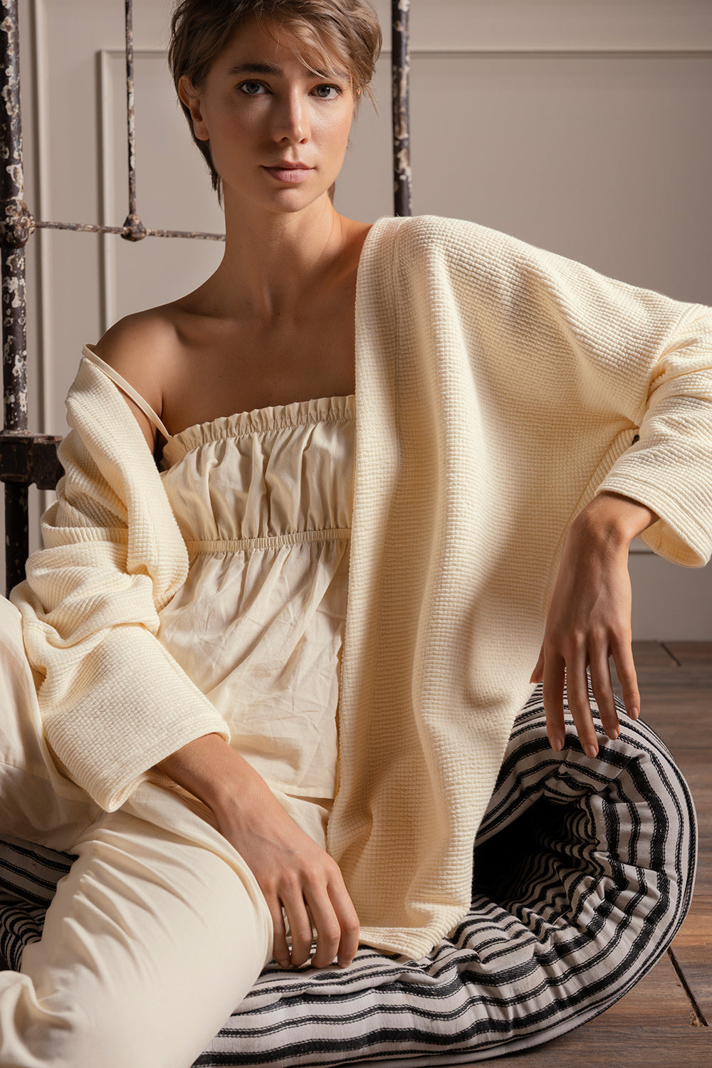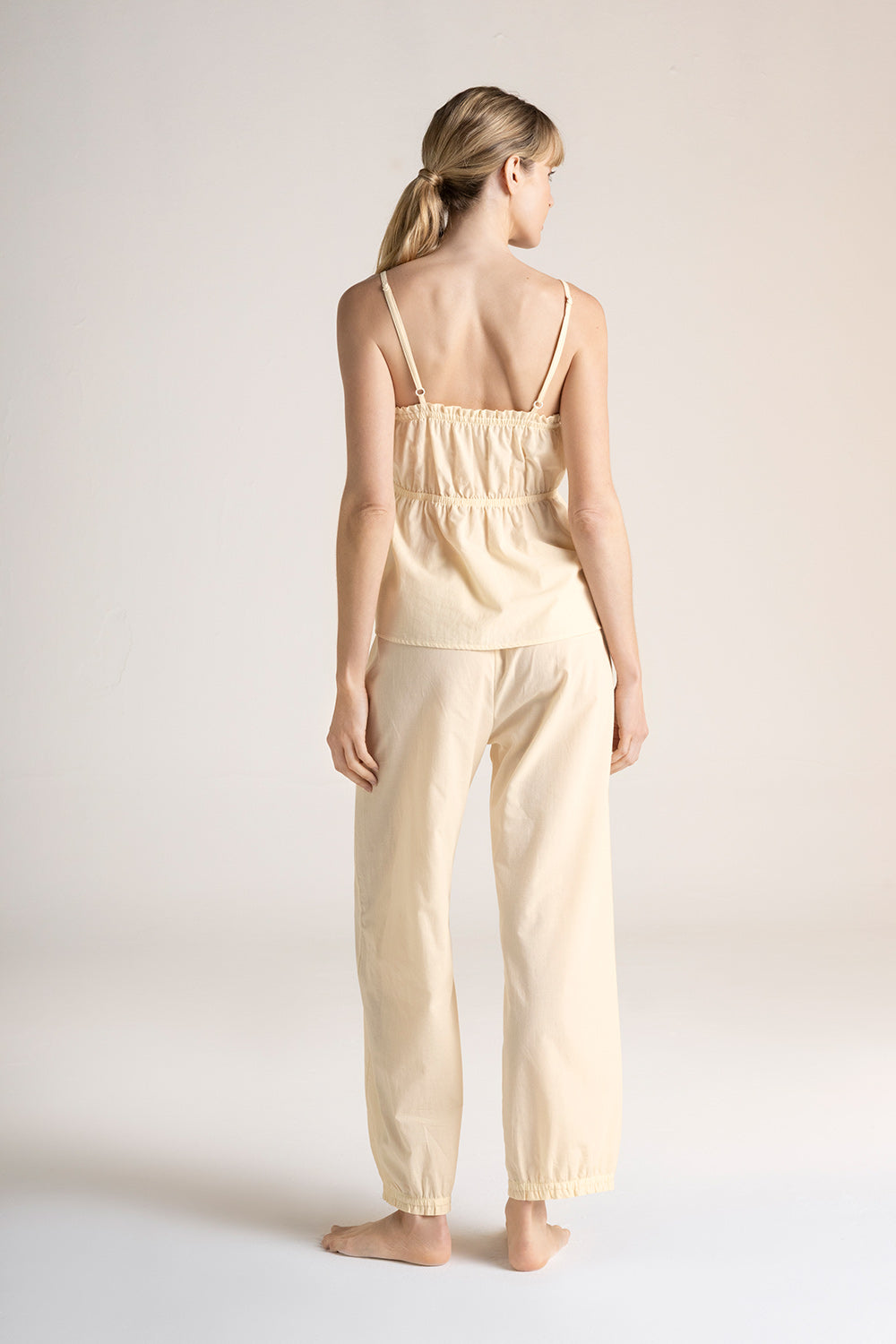 Pijama capri elaborada en algodón fondo entero, camisa de tiras con escote recto recogido, forro para mayor soporte y comodidad, cargaderas ajustables, pantalón corto bota ancha con recogido. Color marfil, Ref. 2525M61