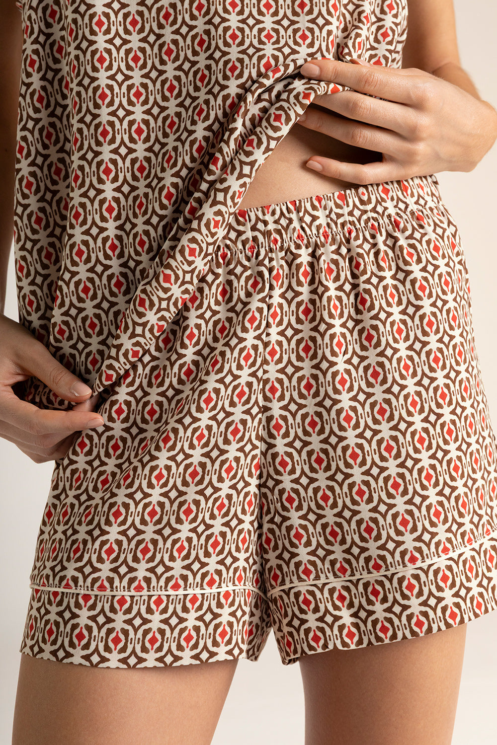 Pijama short elaborada en viscosa con estampado corbatero, camisa de tiras con escote en v, top interno para mayor soporte y comodidad, cargaderas ajustables, shorts clásicos de bota recta. Color estampado, Ref. 2533061