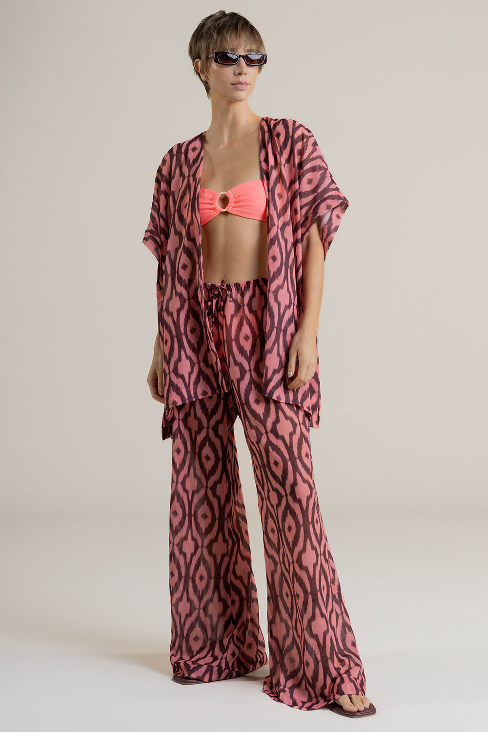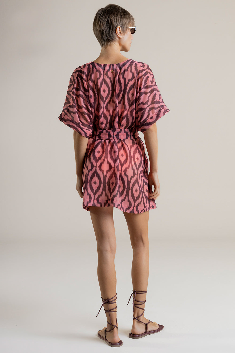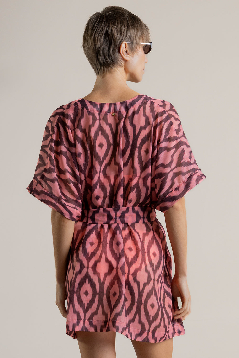 Cover up corto 100% en poliéster estampado en color salmón y terracota, abierto con cinturón para un mejor ajuste y un fit personalizado, tela suave y ligera, detalle moneda con la "t" grabada en baño de oro, característica de nuestra marca para evitar oxidación. Color estampado salmón/terracota, Ref. 0A28053