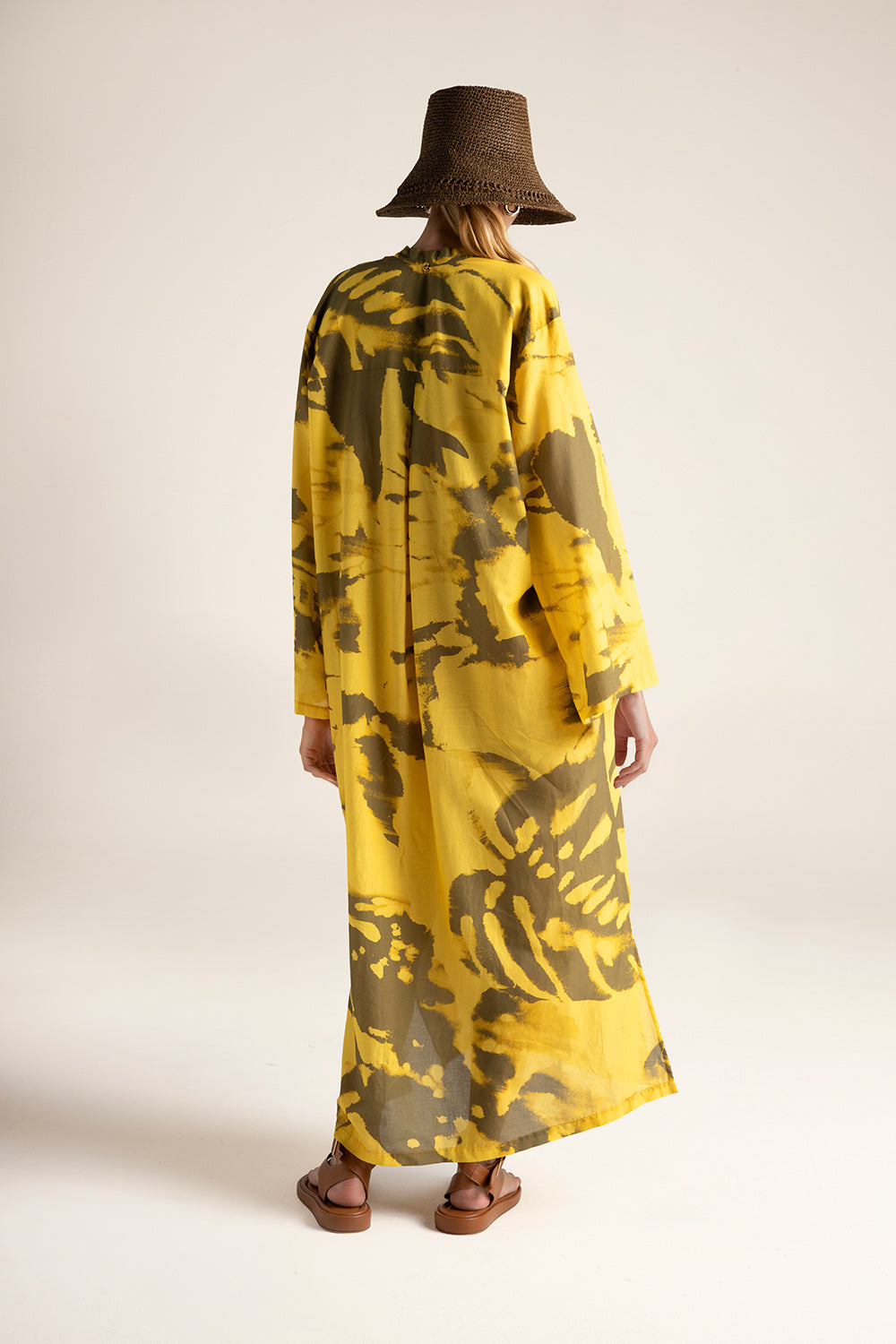 Cover up largo en tela estampada, escote en v, manga larga, aberturas laterales en el bajo, prense central en la espalda y moneda en baño de oro grabada conla ''t'', como detalle distintivo de la marca. Color estampado amarillo / verde, Ref. 0A39062