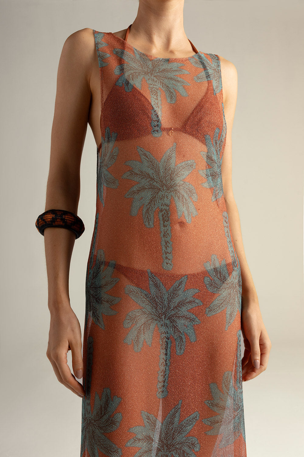 Cover up largo en malla con lurex dorado, estampado de palmeras terracota y azul; sisa profunda; y detalle moneda con la “T” grabada en baño de oro, característico de nuestra marca para evitar oxidación. Color estampado terracota/azul/ lurex dorado, Ref. 0A75061