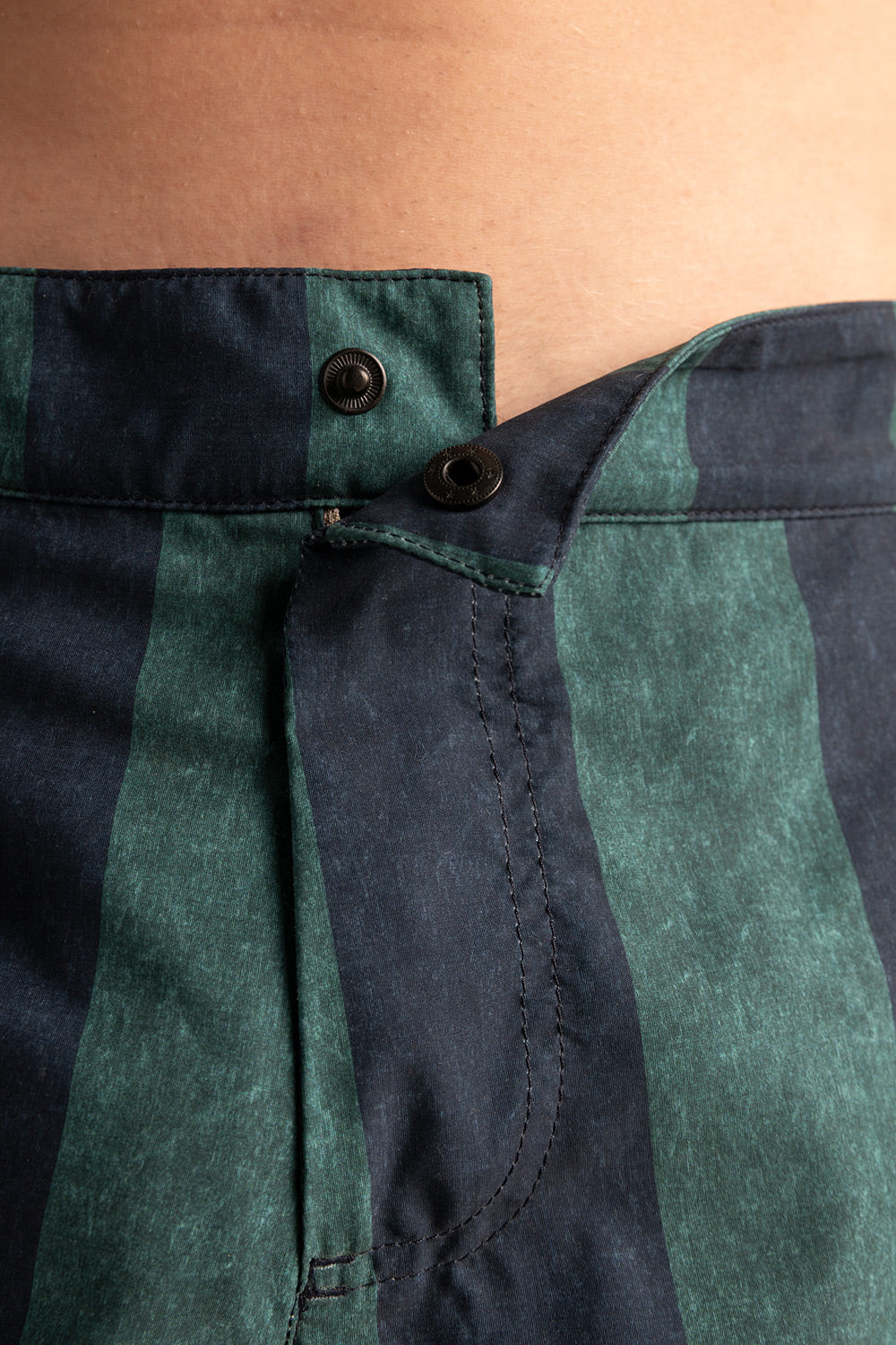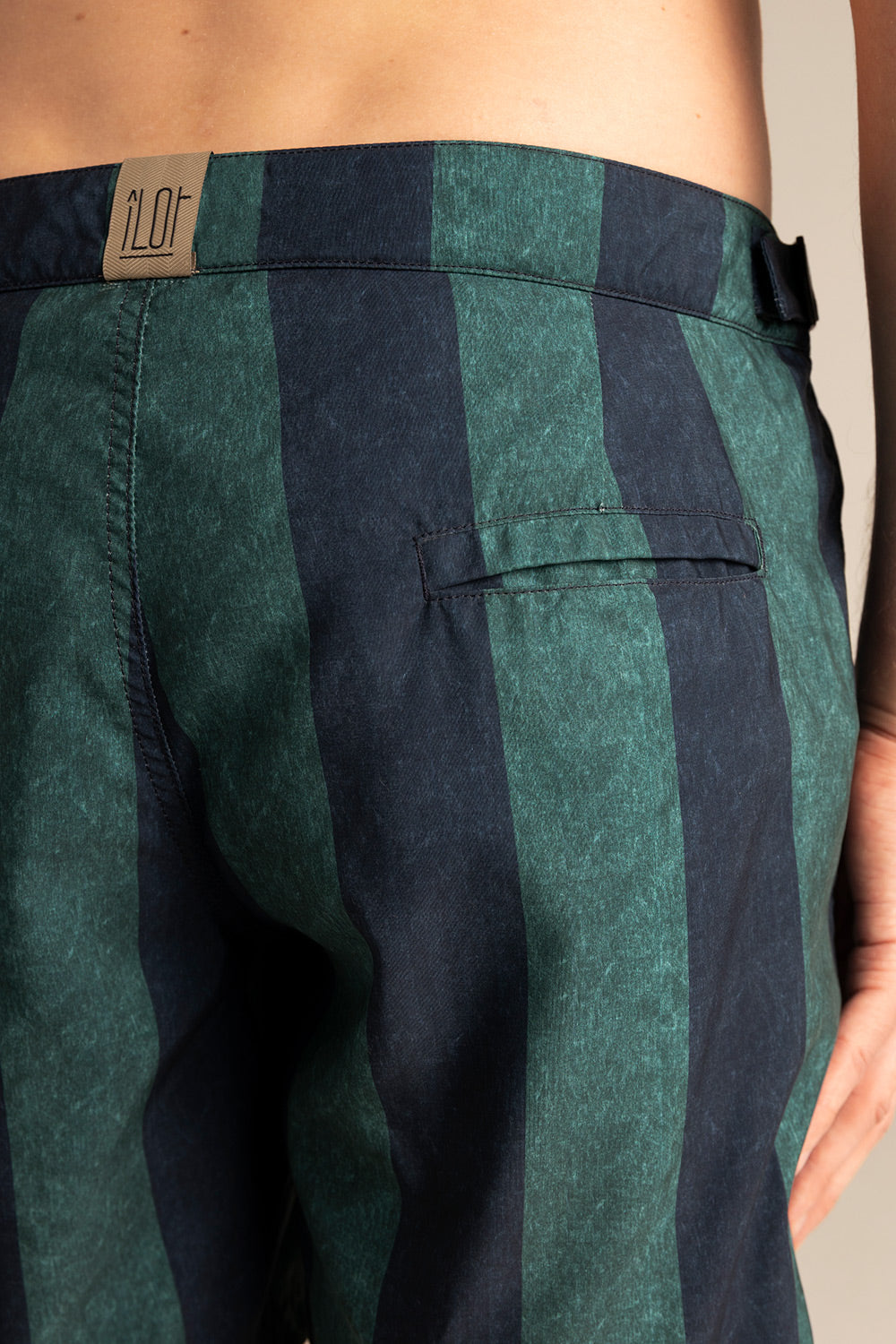 Pantaloneta surf con estampado de rayas azules y verdes con sistema de ajuste lateral mediante hebillas negro mate en zamak, broche en negro mate en pretina para cierre y bolsillo de ribete.. Color azul/verde, Ref. MH41S62