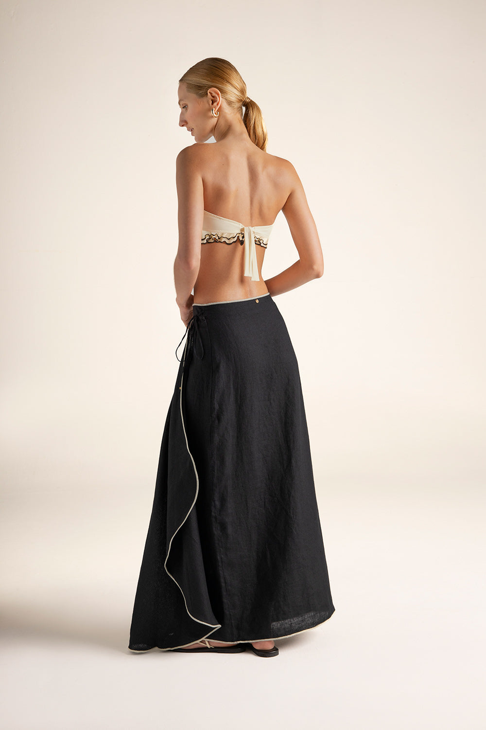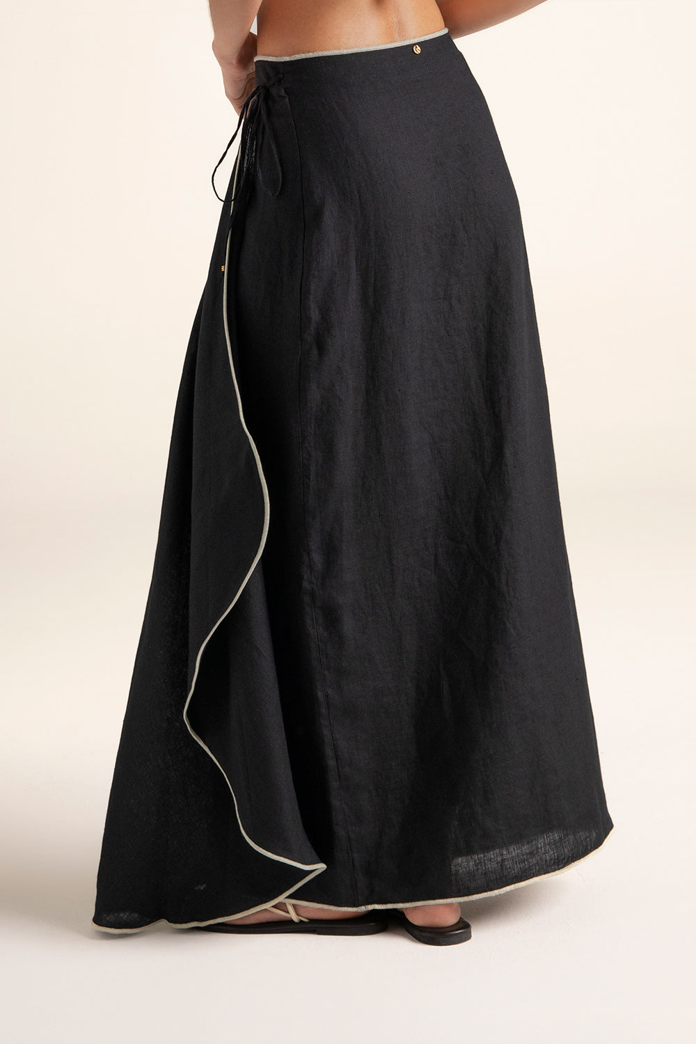 Falda pareo larga en lino con terminación de filete en contraste, cruzada al frente con tira ajustable y botones internos, punteras en baño de oro como detalle final en las tiras y moneda en baño de oro grabada con la ''t'', como detalle distintivo de la marca. Color negro, Ref. 0F56N62