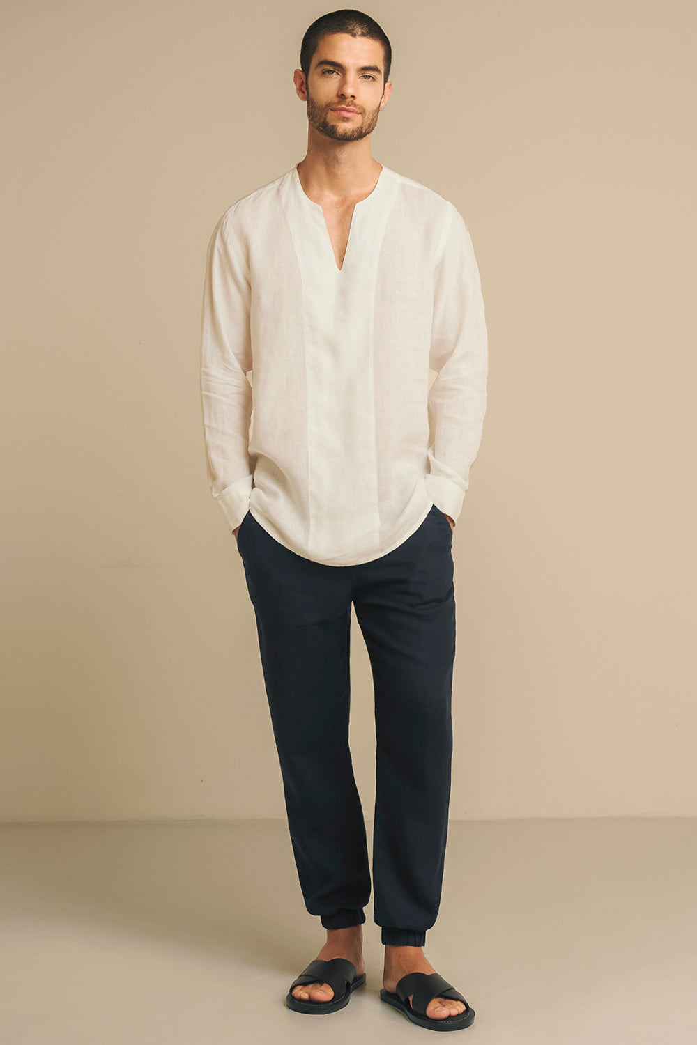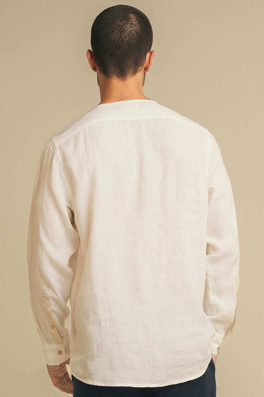 Camisa en lino manga larga silueta clásica, cuello en v. Color Blanco, Ref. SH05001