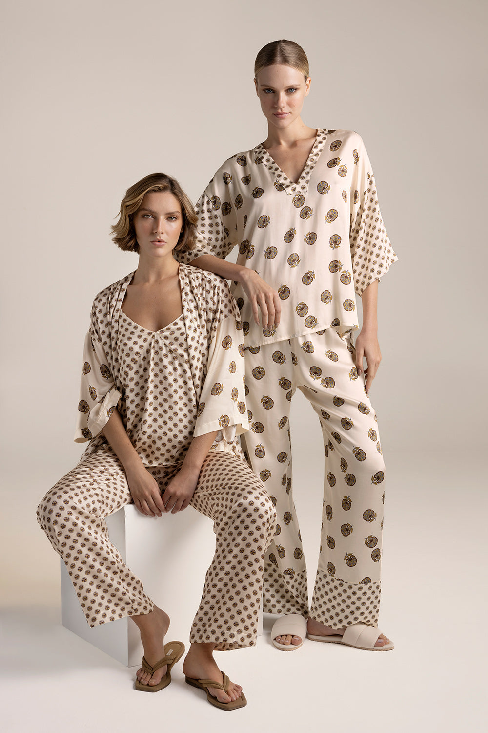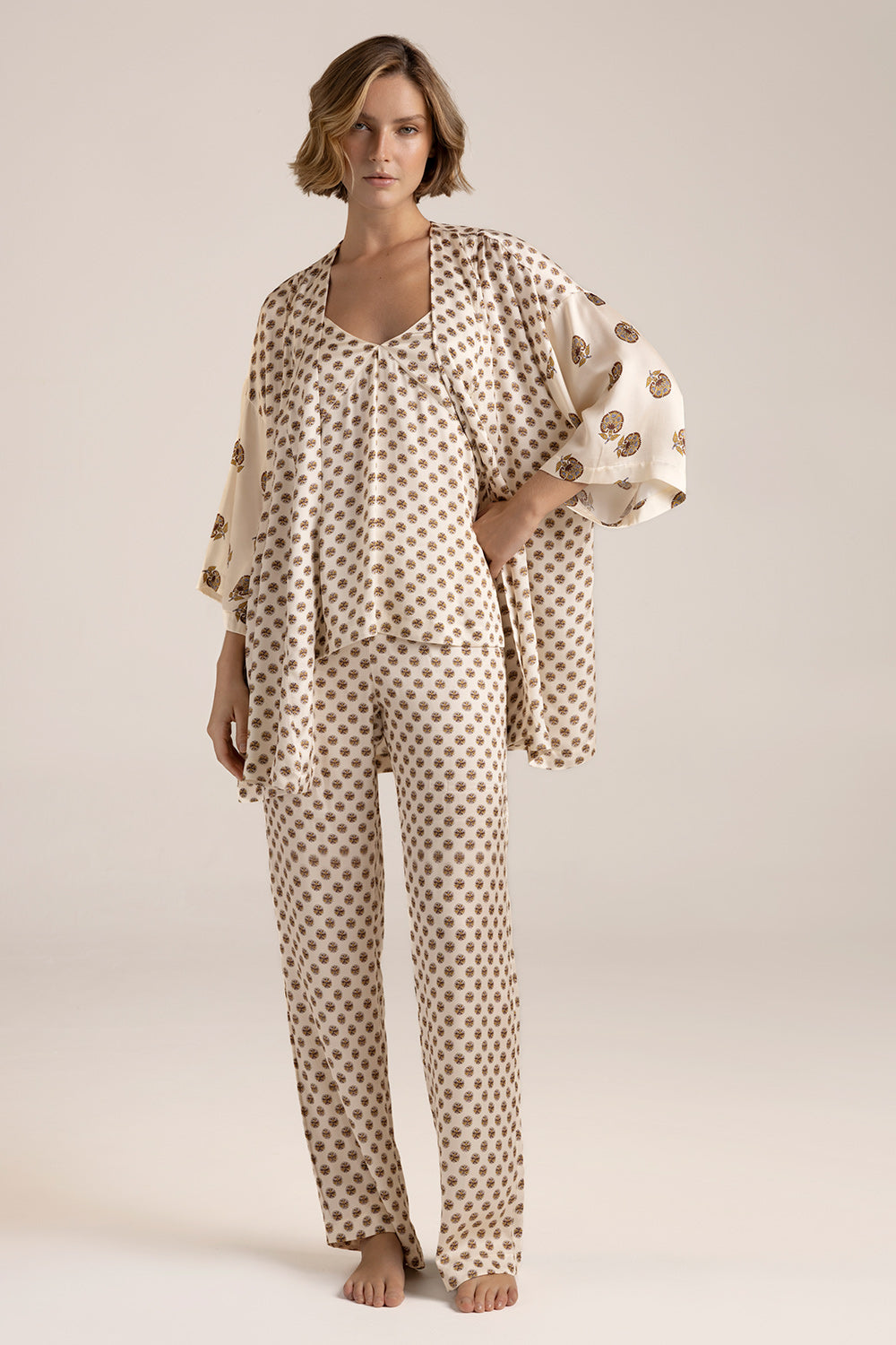 Kimono corto elaborado en satén estampado, manga 3/4, lazo en la cintura para amarrar. Color marfil estampado, Ref. 0587062