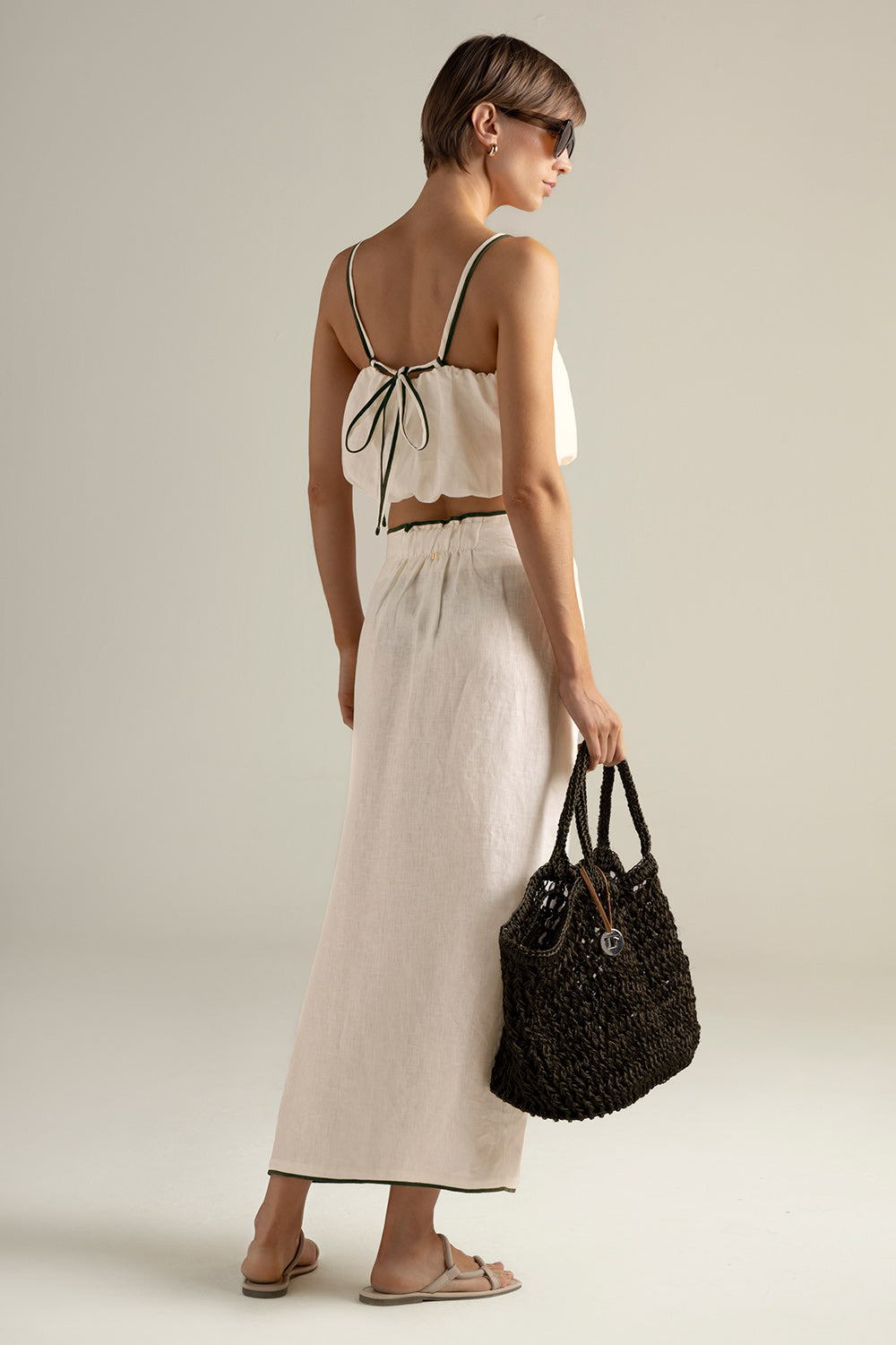 Top corto con tiras en lino 100% color crema; con costuras filete expuestas en color verde en tiras; silueta globo, con forro interno; detalle moneda con la "T" grabada en baño de oro, característico de nuestra marca. Color crema, Ref. 0A09C61