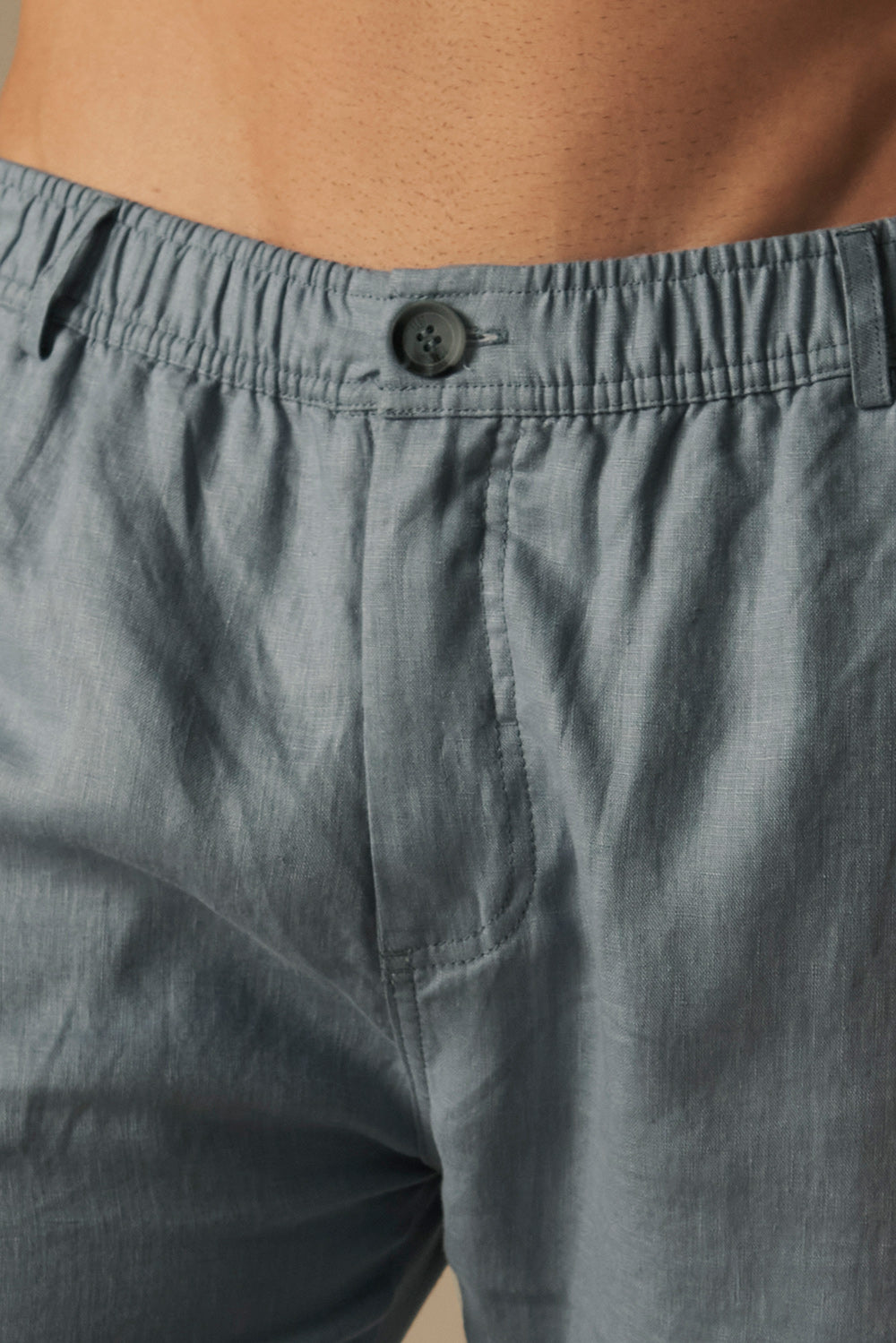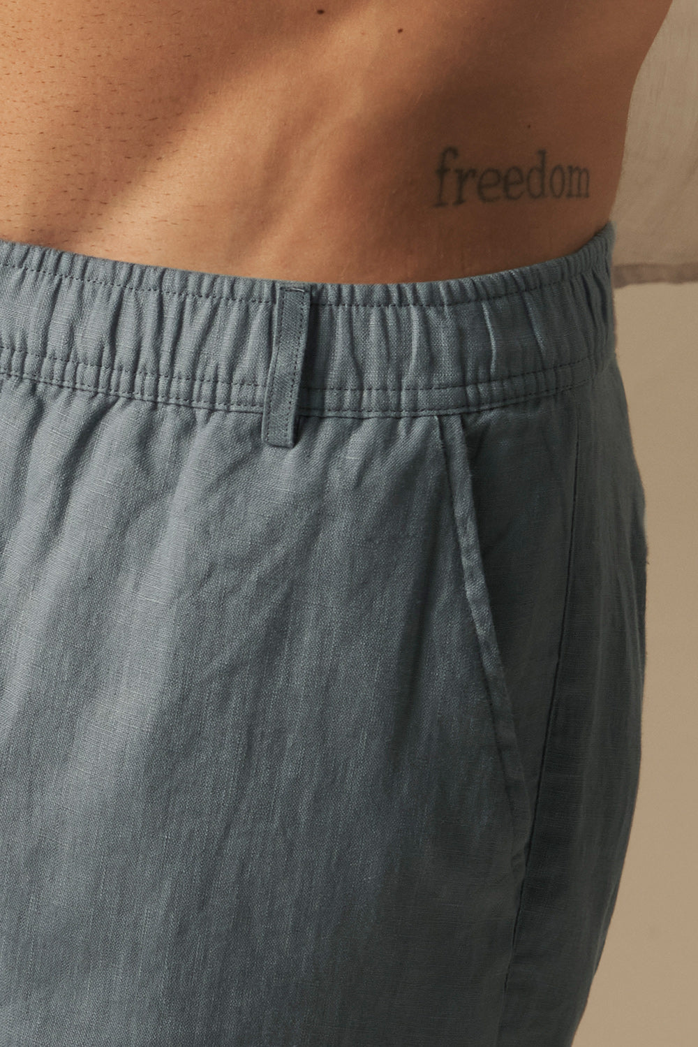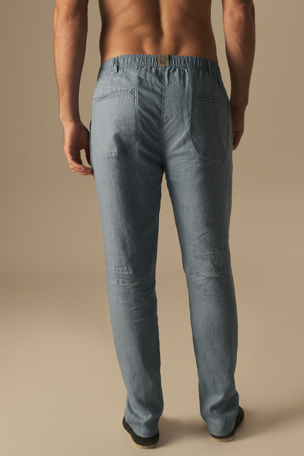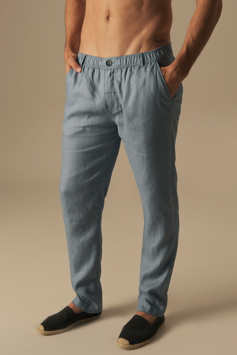 Pantalón cabo en lino azul, silueta clásica, cintura enresortada, pasadores, botón para cierre en cintura, bolsillos laterales, bolsillos de ribete traseros . Color azul gris, Ref. PH55052