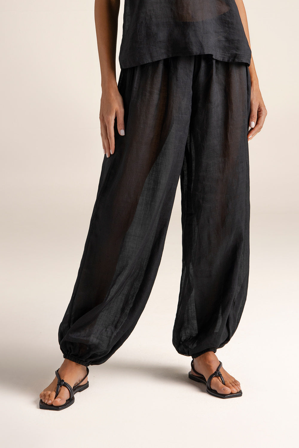 Pantalón en tela ramio, acabado semitransparente, en silueta tipo globo que ajusta con elástico en el tobillo, cintura resortada, bolsillo de parche en posterior derecho y moneda en baño de oro grabada con la ''t'', como detalle distintivo de la marca. Color negro, Ref. 0A36N62