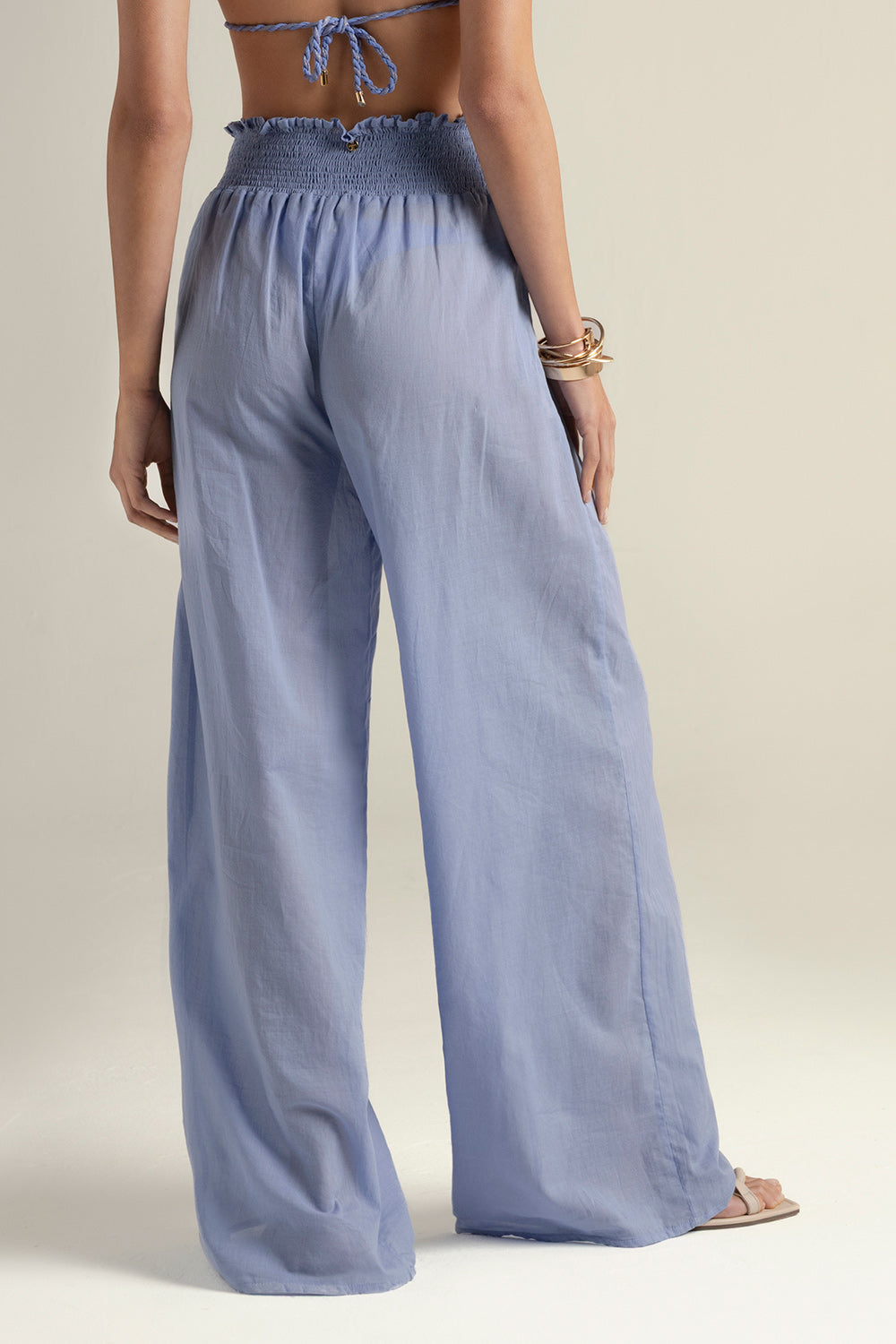 Pantalón en algodón 100%, color azul claro; cintura en nido de abeja; tiro alto; y detalle moneda con la “T” grabada en baño de oro, característico de nuestra marca. Color azul claro, Ref. 0A55A61