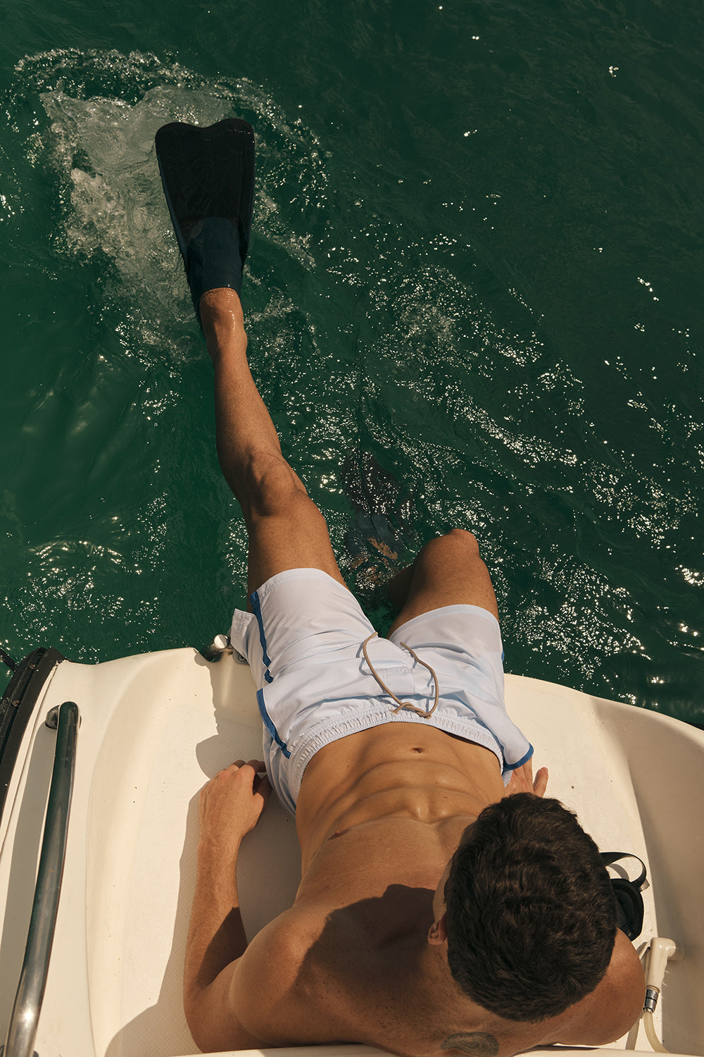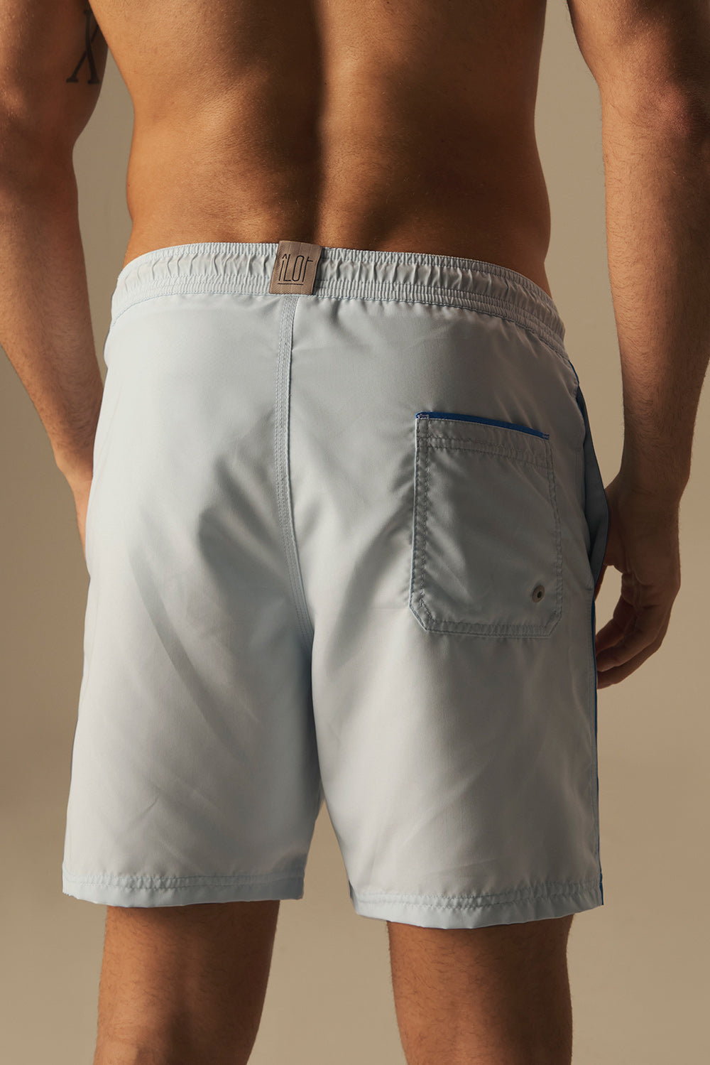 Pantaloneta bahía bloque de color azul, silueta clásica con elástico en cintura y cordón pardo con punteras de caucho, ojaletes pardo mate en zamak y bolsillo de parche. Color azul claro/azul oscuro, Ref. CH19052-MH19052-LH19052