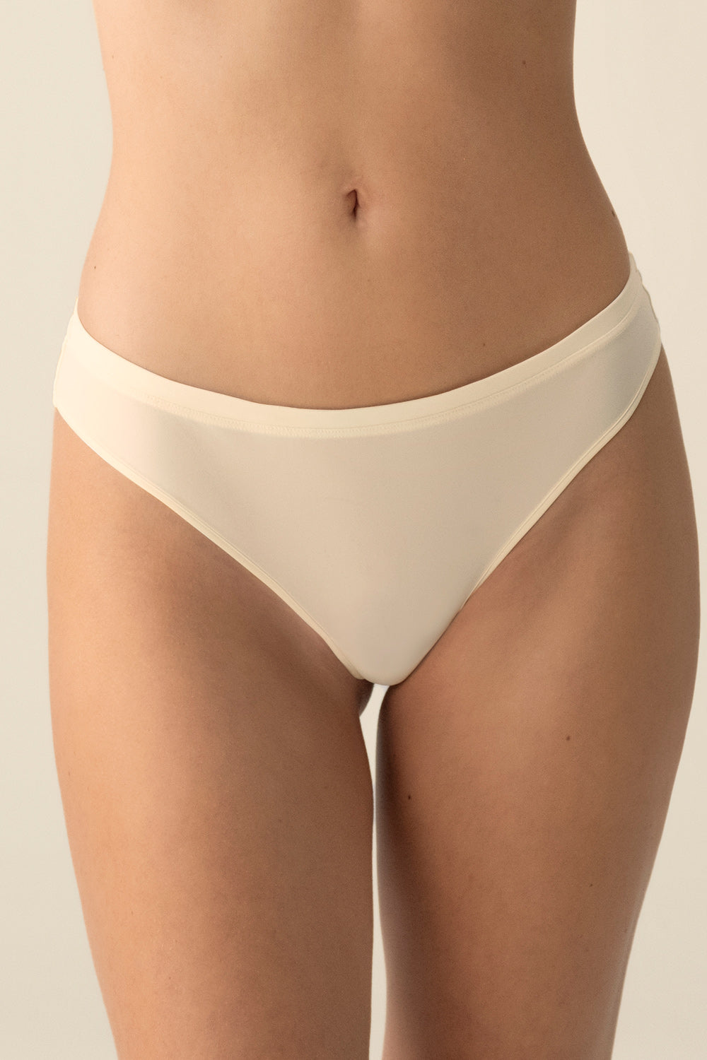 Panty semibrasilero de tiro medio elaborado en microfibra con tacto frío, posterior con efecto invisible, refuerzo en algodón. Color marfil, Ref. 0261052