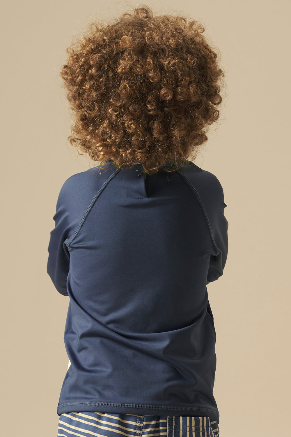Camiseta kids en lycra azul oscura con estampado de ballena, con mangas ranglan . Color azul oscuro, Ref. LK07A52