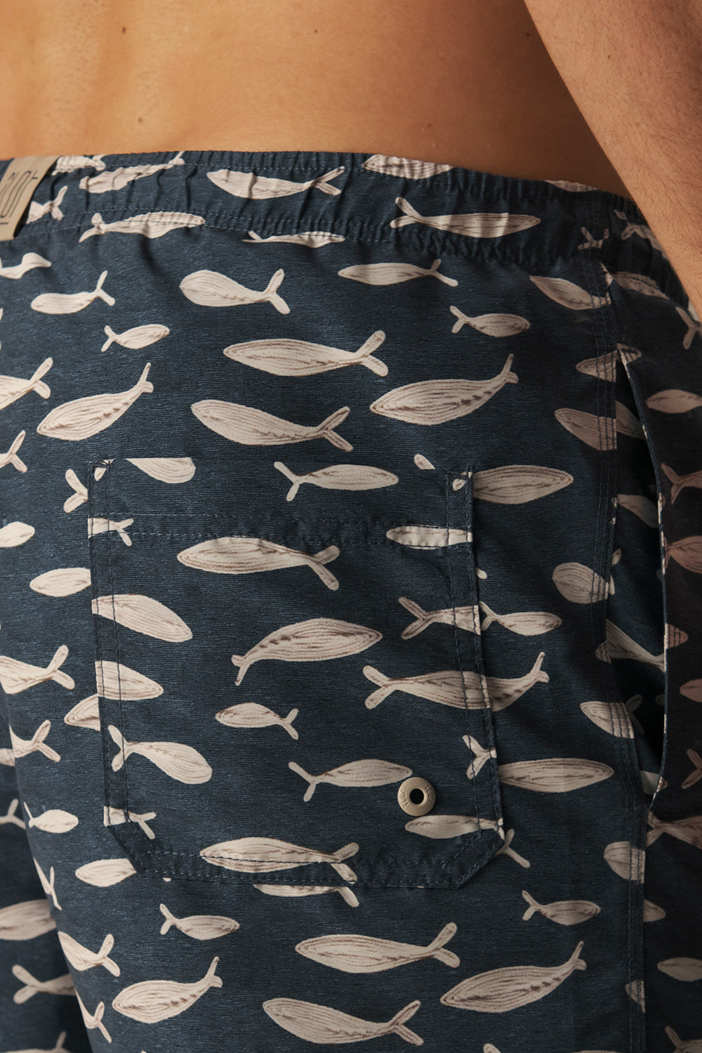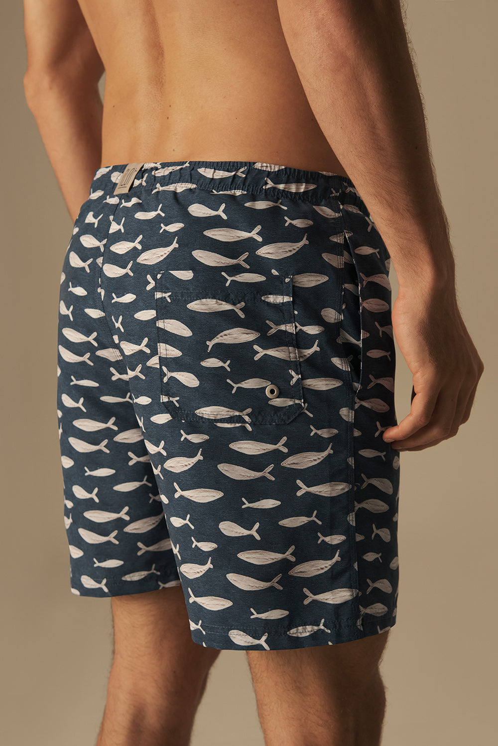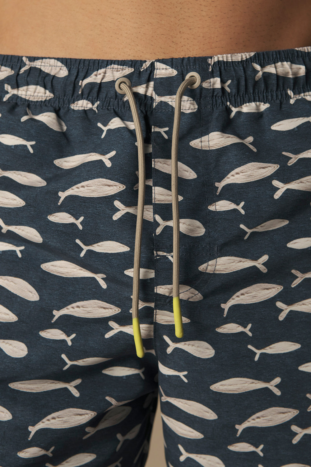 Pantaloneta bahía corta estampado ballenas, silueta clásica con elástico en cintura, cordón pardo con punteras de caucho neón, ojaletes pardo mate en zamack y bolsillo de parche. Color azul, Ref. CH16052-MH16052-LH16052