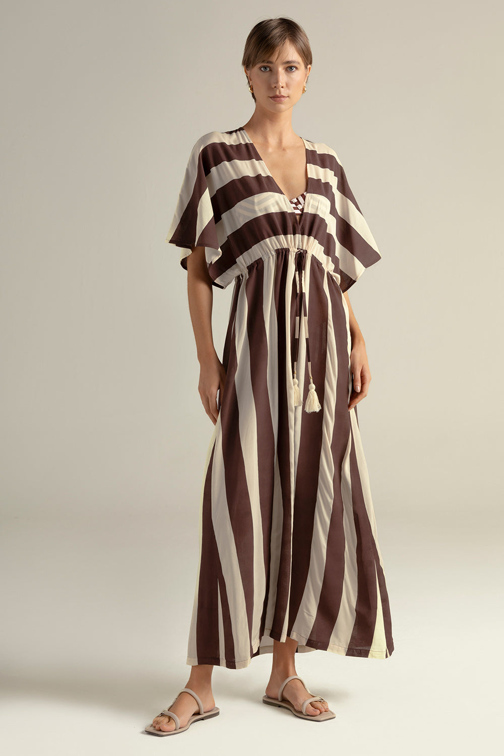 Cover up largo en bloques de estampado de rayas marfil y vino en algodón 100%; escote en V profundo; manga amplia; cordón con borla en cintura para un fit personalizado; detalle de moneda con la “T” grabada en baño de oro, característico de nuestra marca. Color estampado vino/marfil, Ref. 0A53061