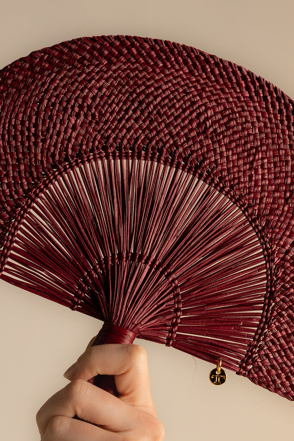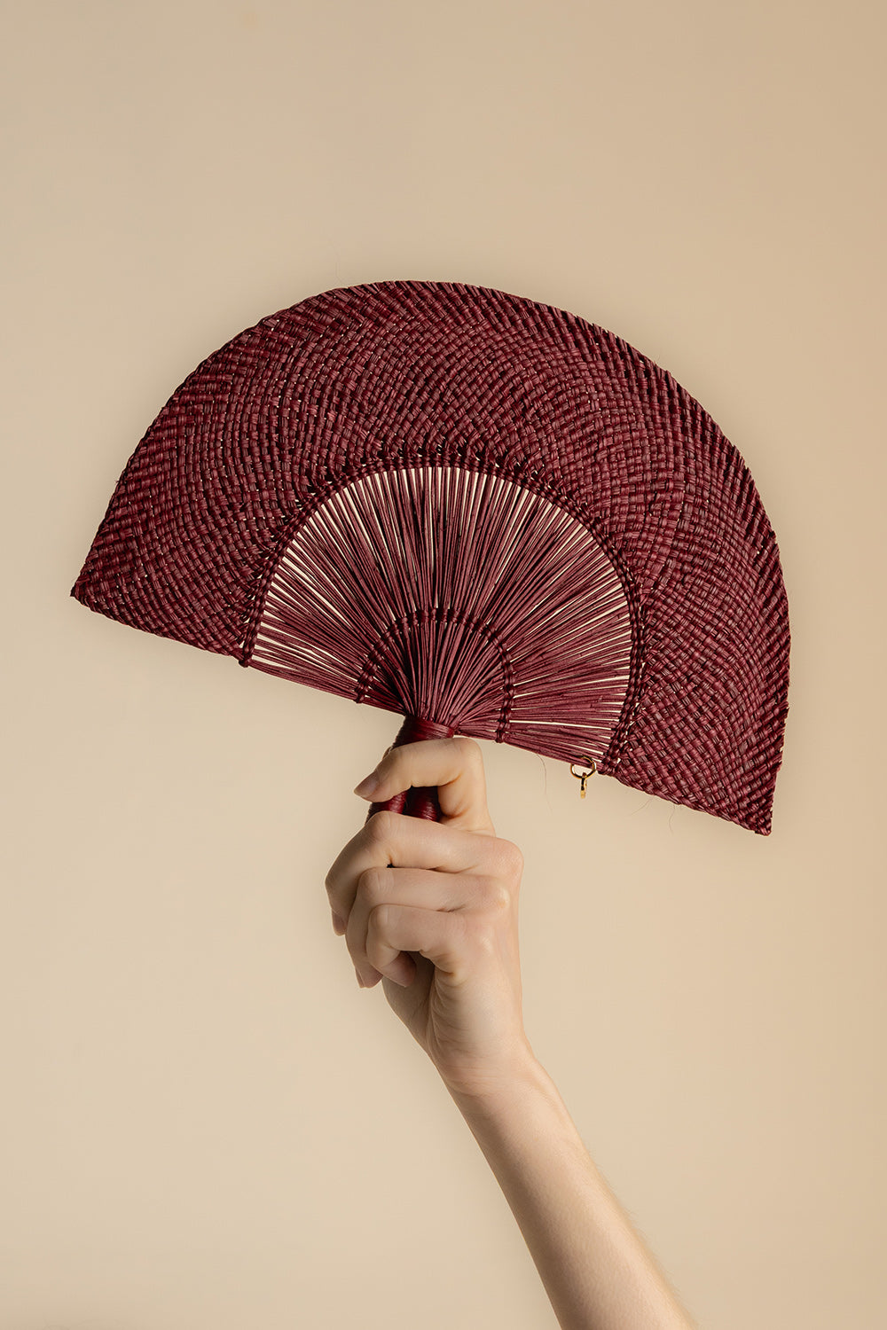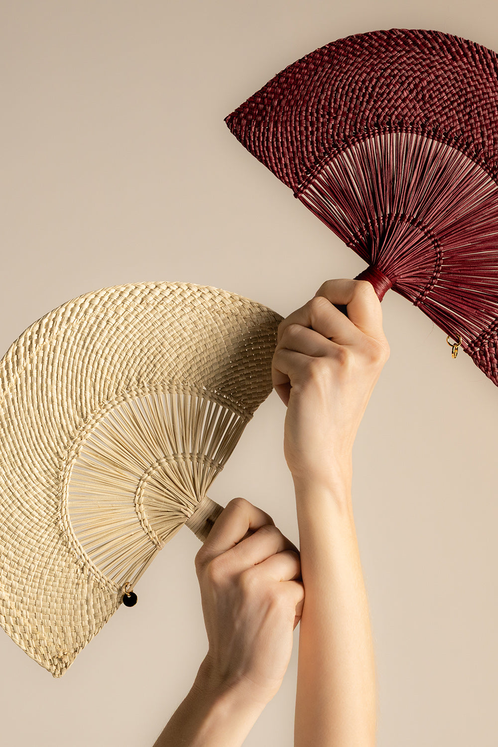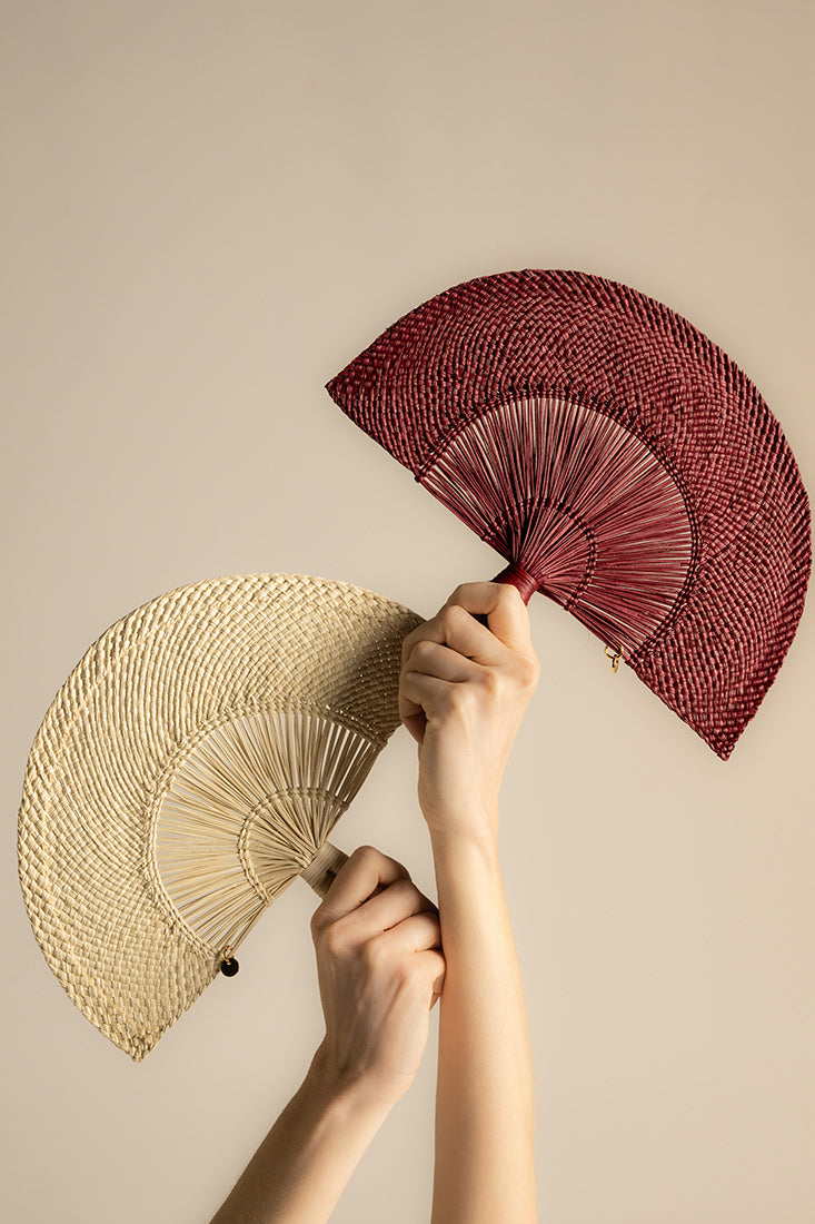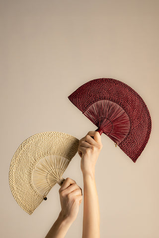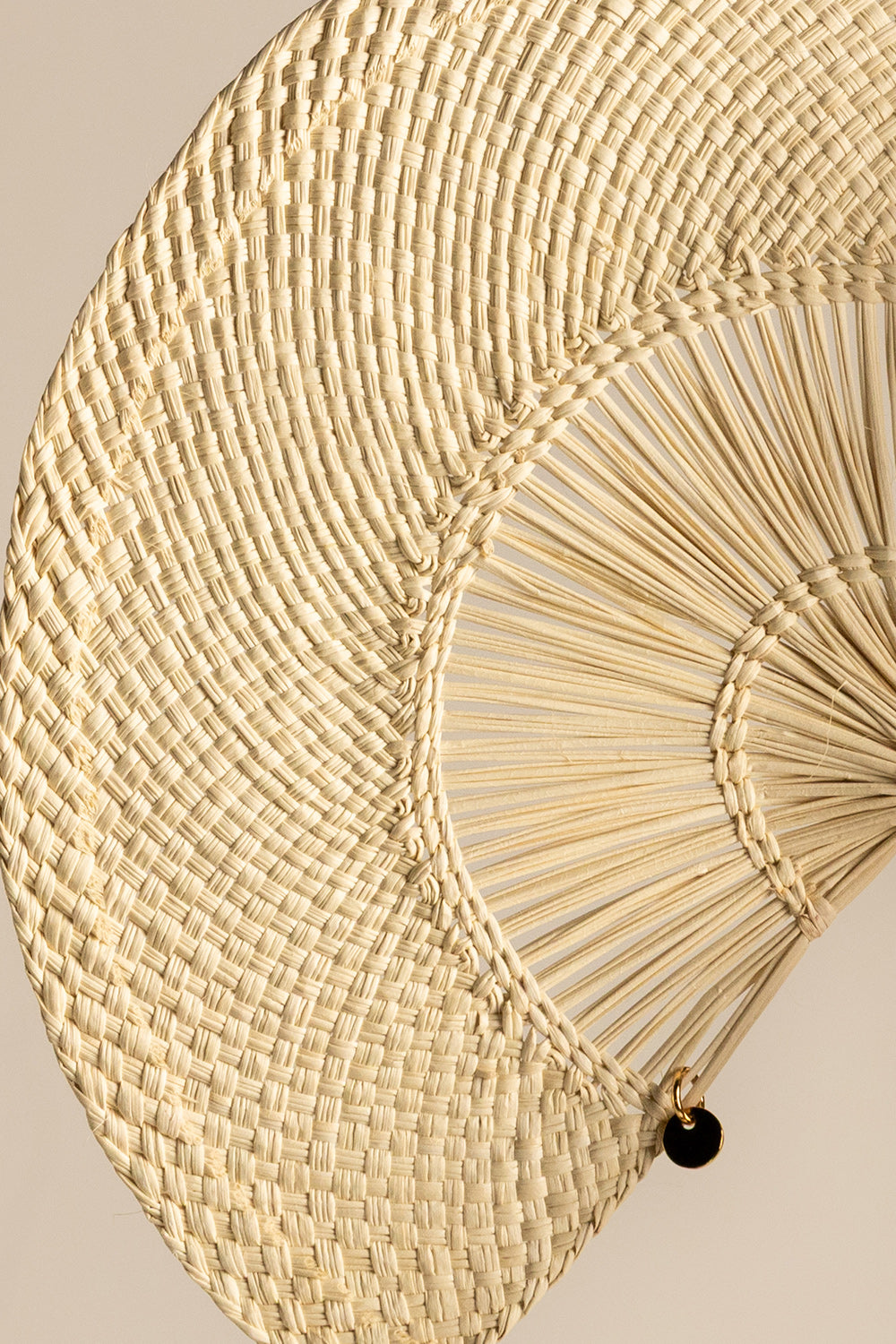 Abanico tejido a mano por madres artesanas de Colombia. Color crudo. Ref. 0OBS048.