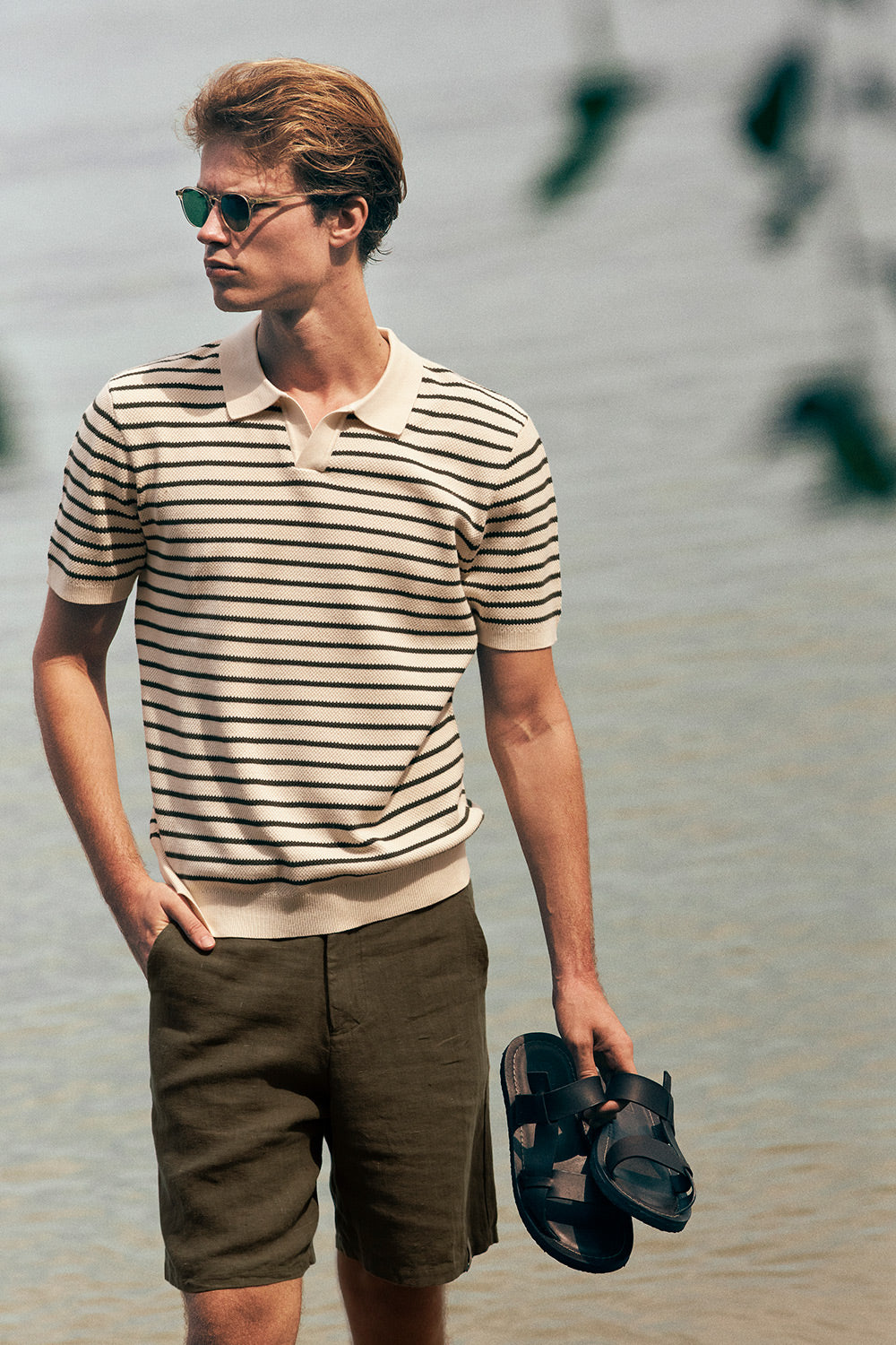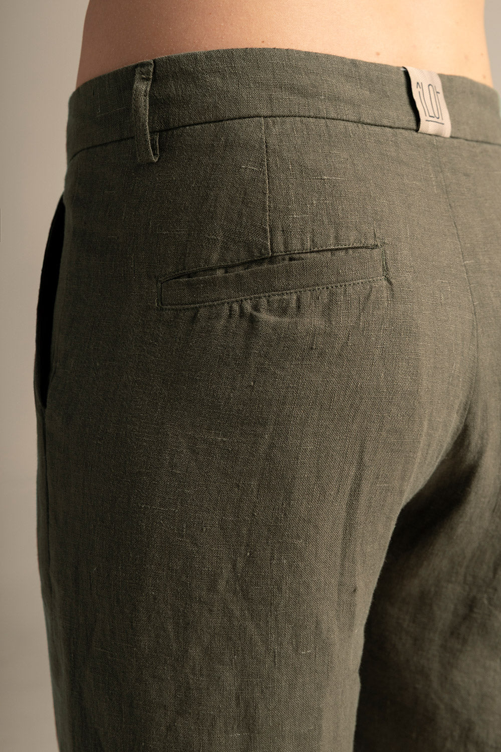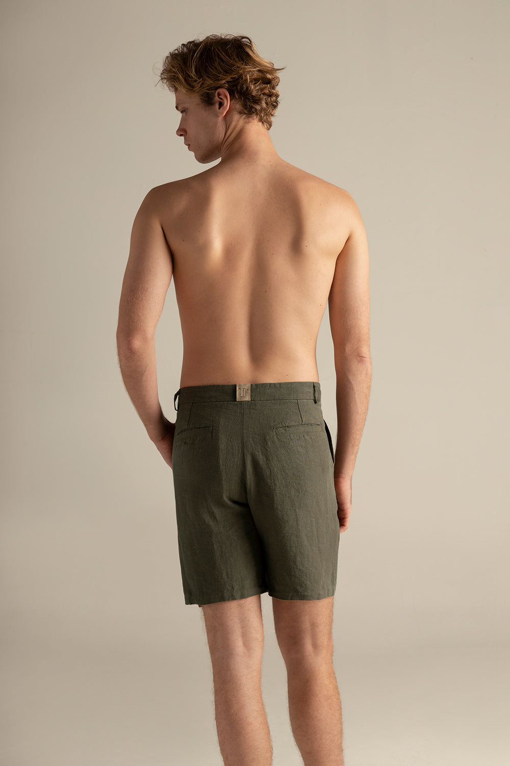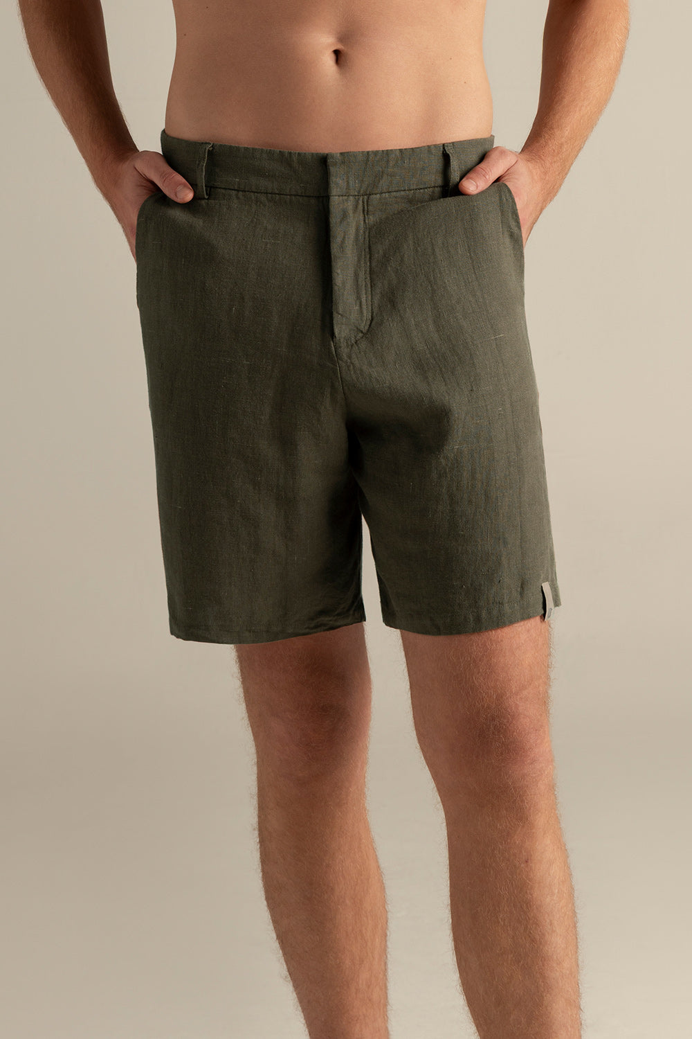 Bermuda en lino verde oliva, relaxed fit, pretina con broche invisible, bolsillos de ribete traseros y pinzas. Color verde oliva, Ref. BH69V62
