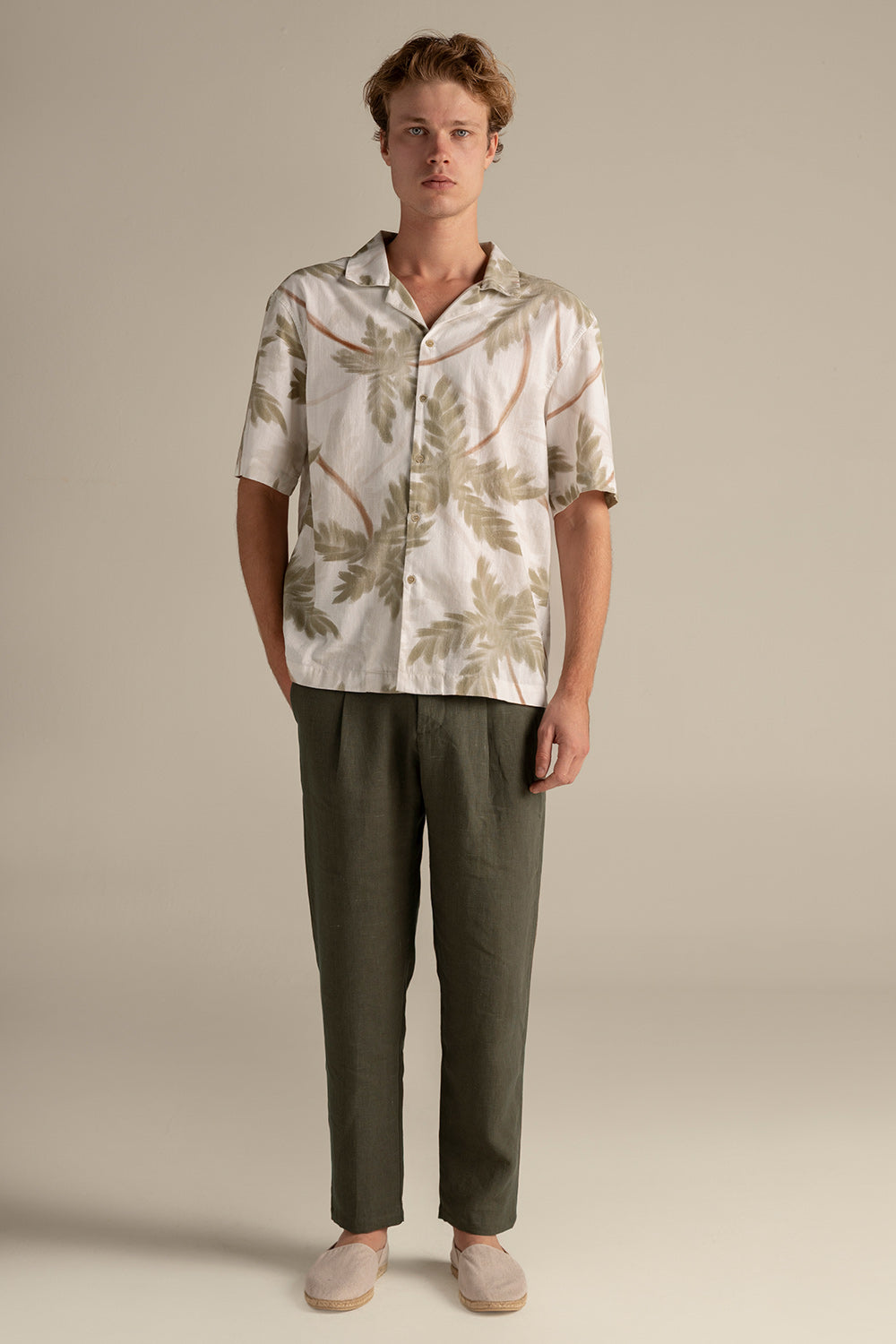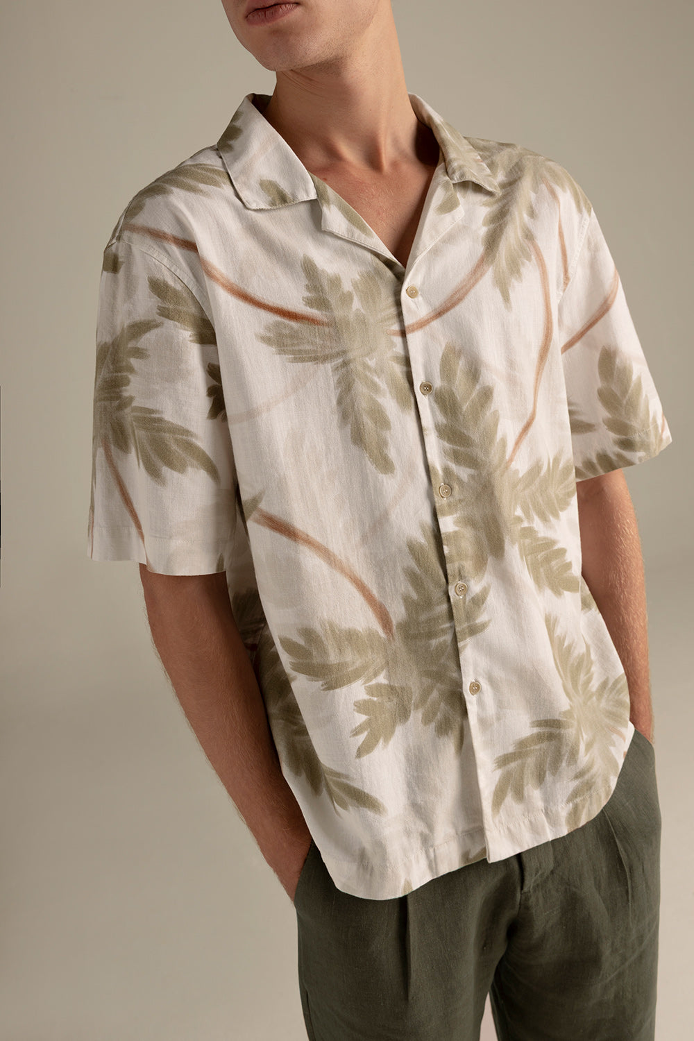 Camisa Ibiza en lino estampado de hojas, manga corta, relaxed fit y cuello bowling. Color caqui/verde, Ref. SH82062