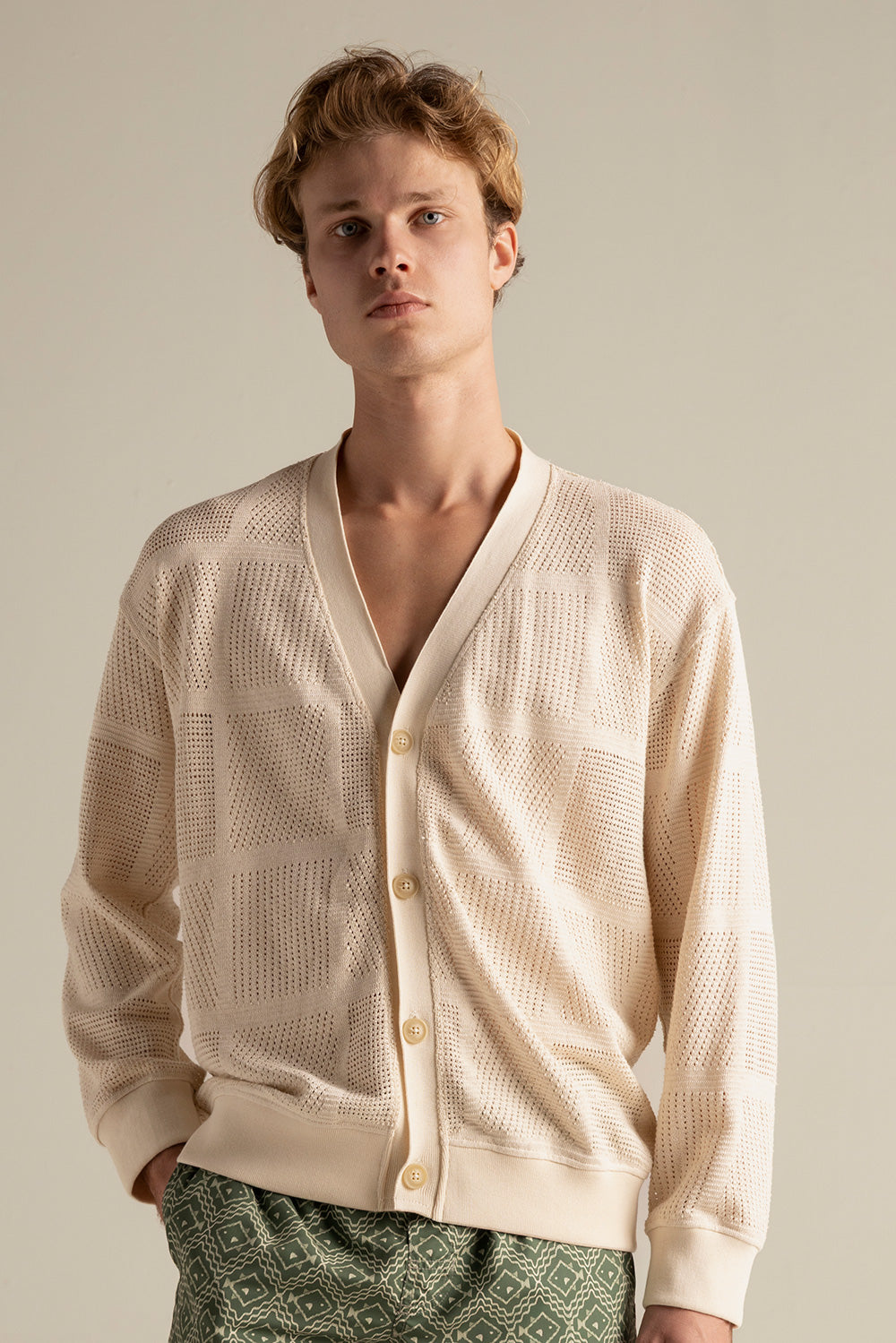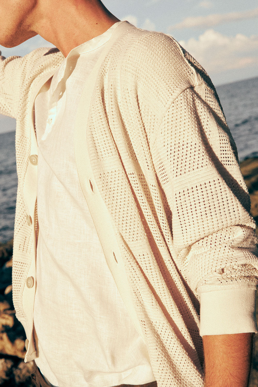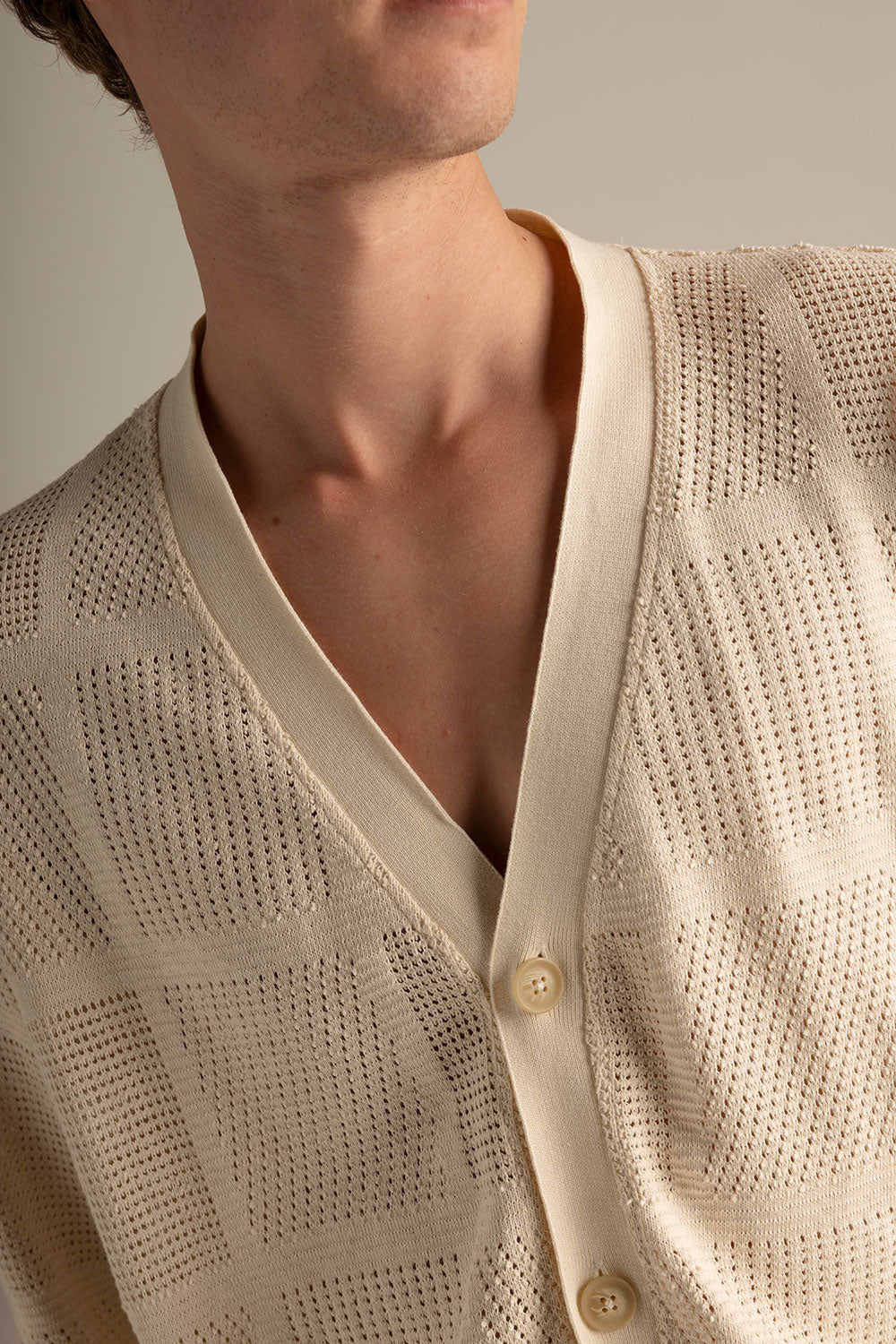 Cárdigan tejido en algodón beige, manga larga, relaxed fit con botones en frente, perilla, puños y fajón en rectilíneo. Color marfil, Ref. SH83B62