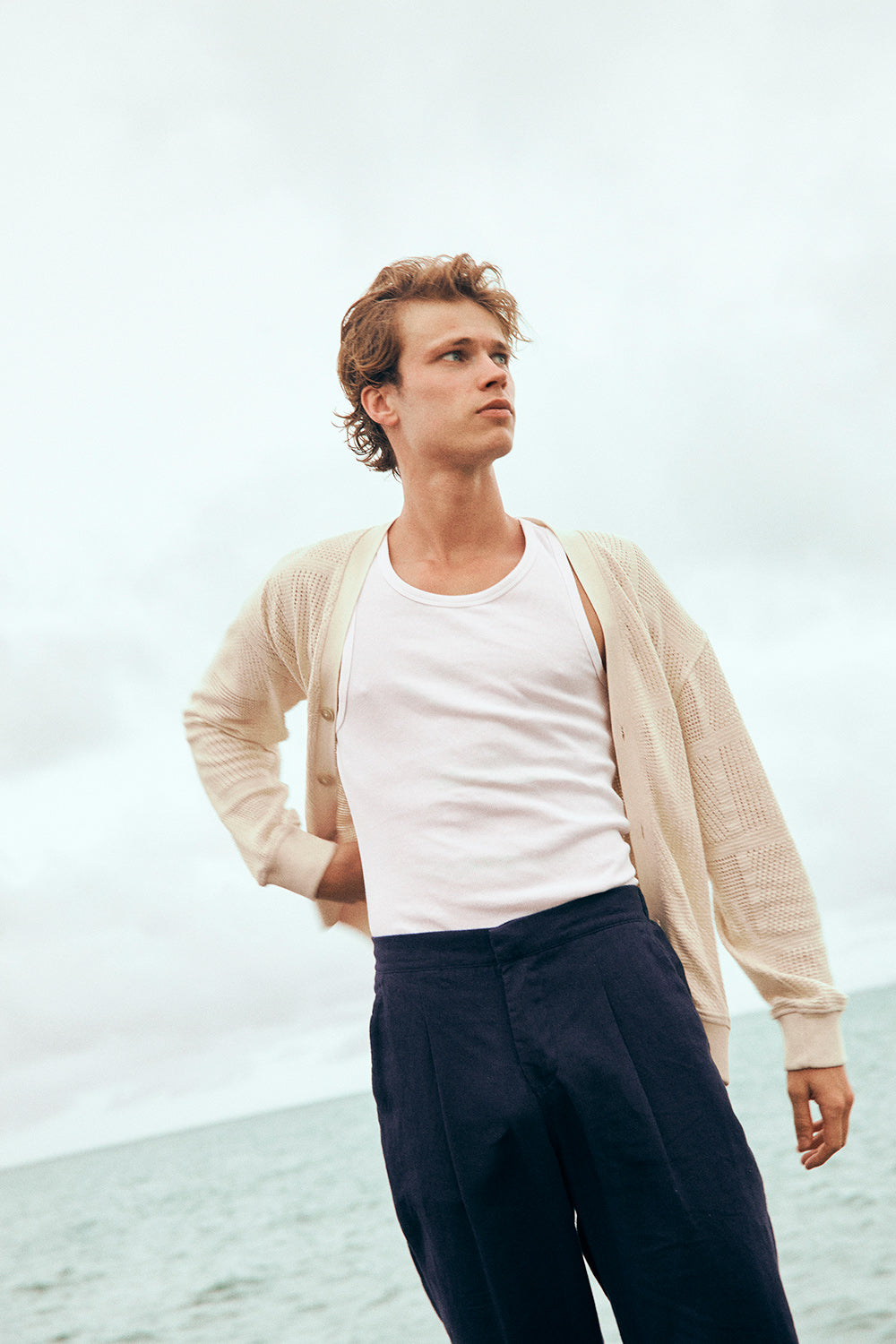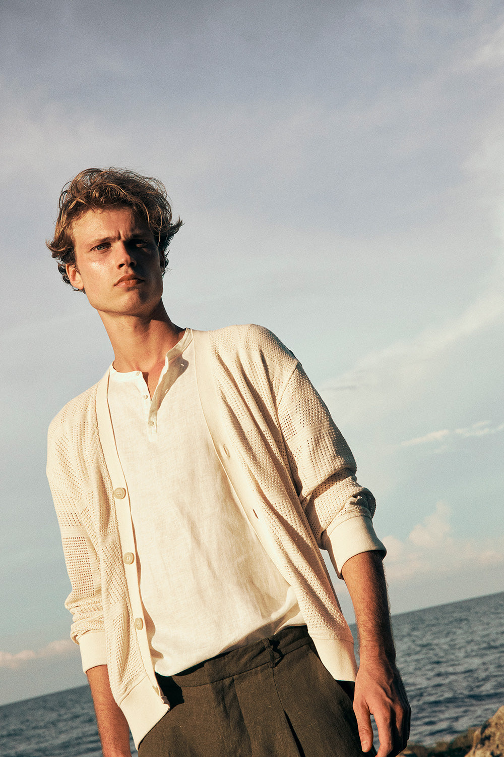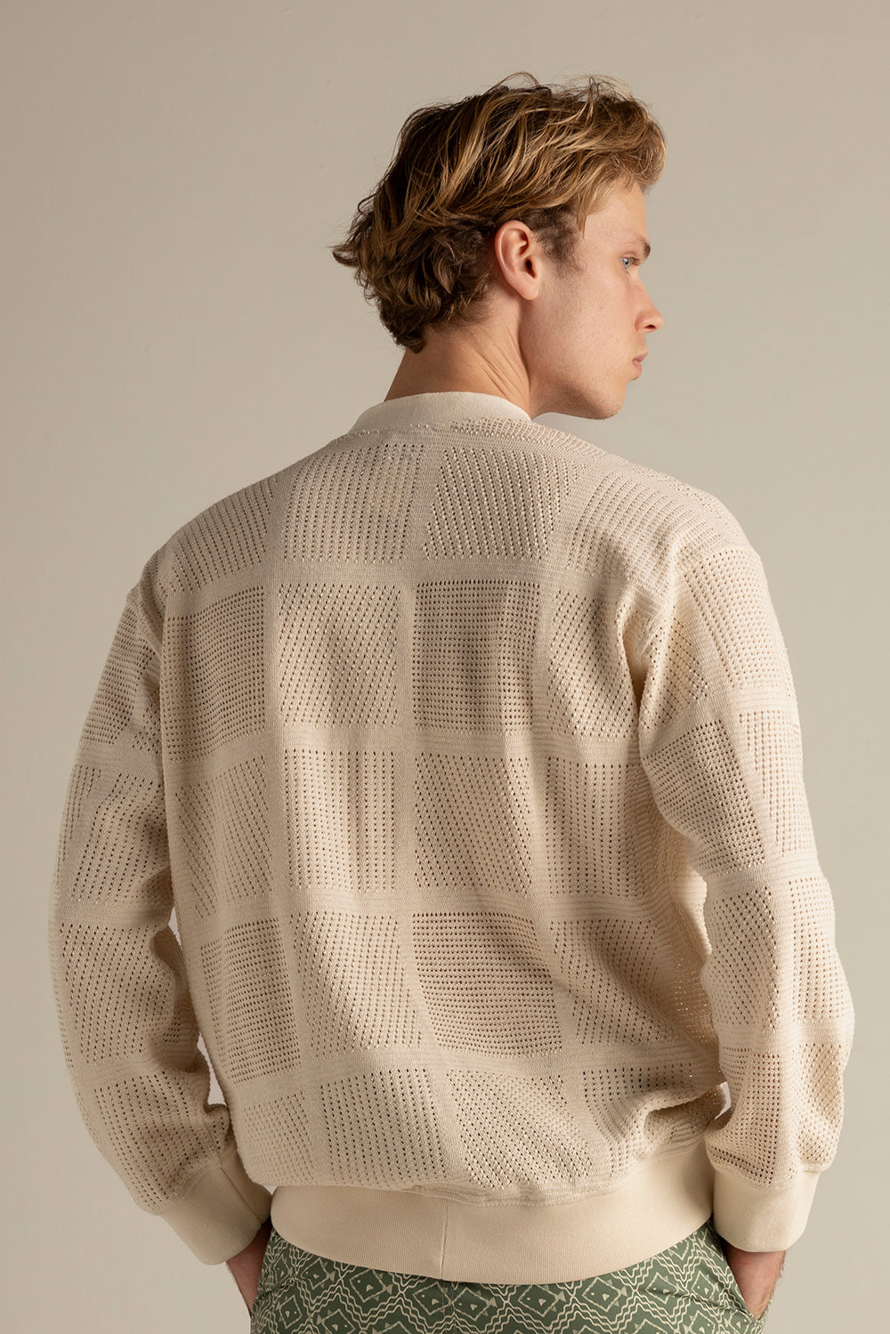Cárdigan tejido en algodón beige, manga larga, relaxed fit con botones en frente, perilla, puños y fajón en rectilíneo. Color marfil, Ref. SH83B62