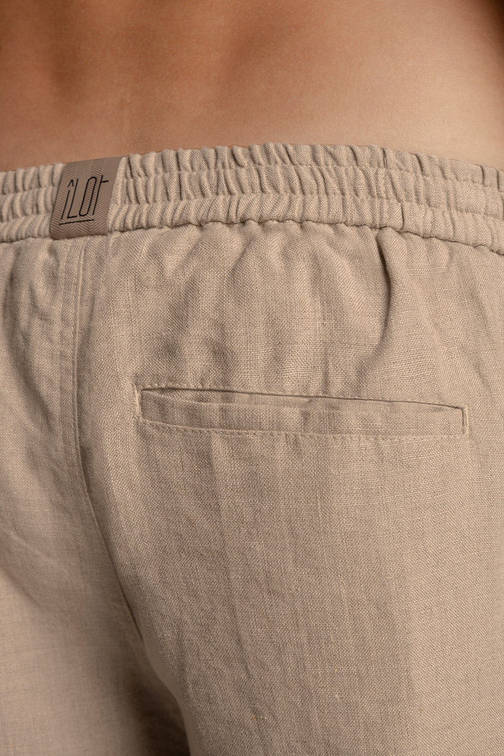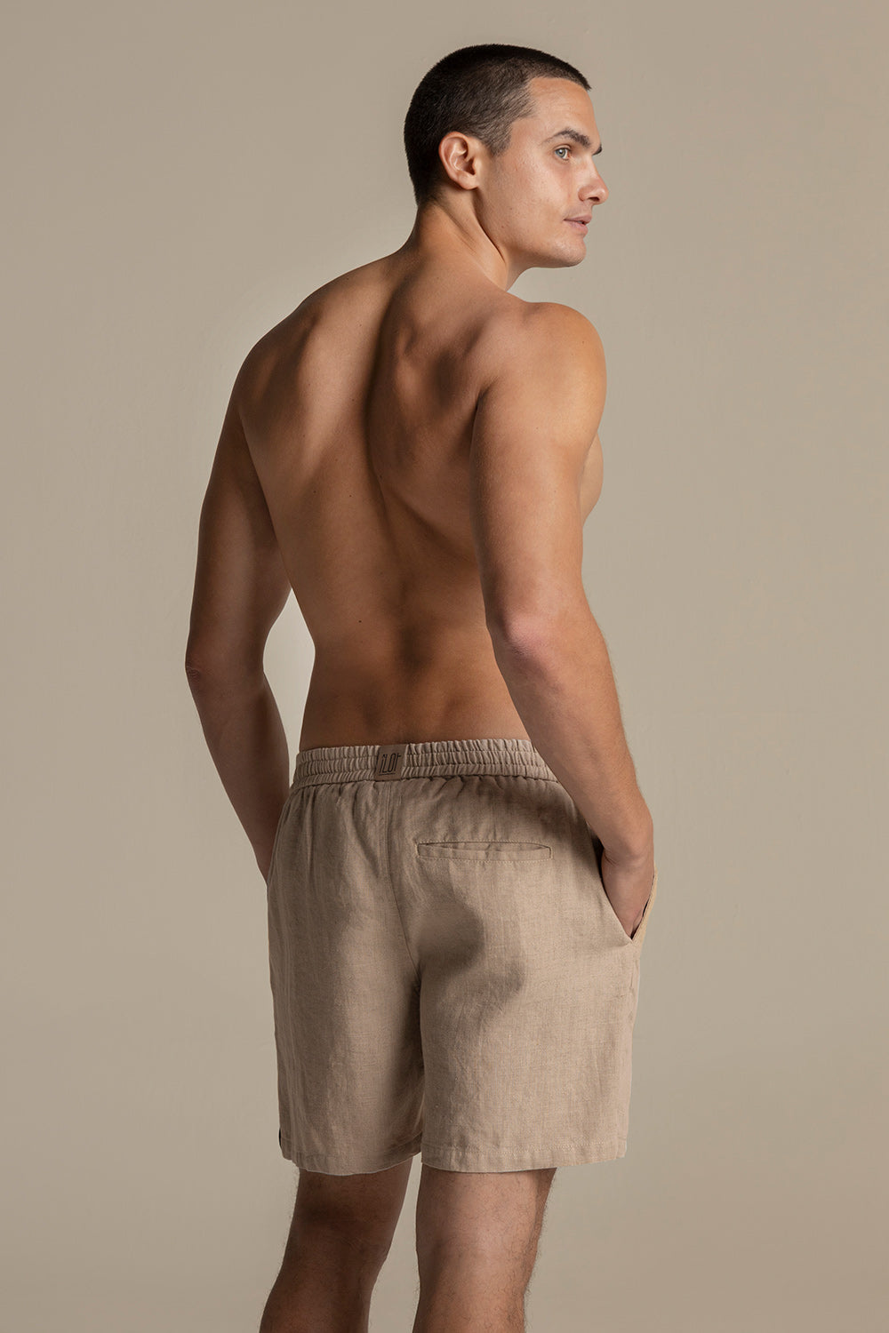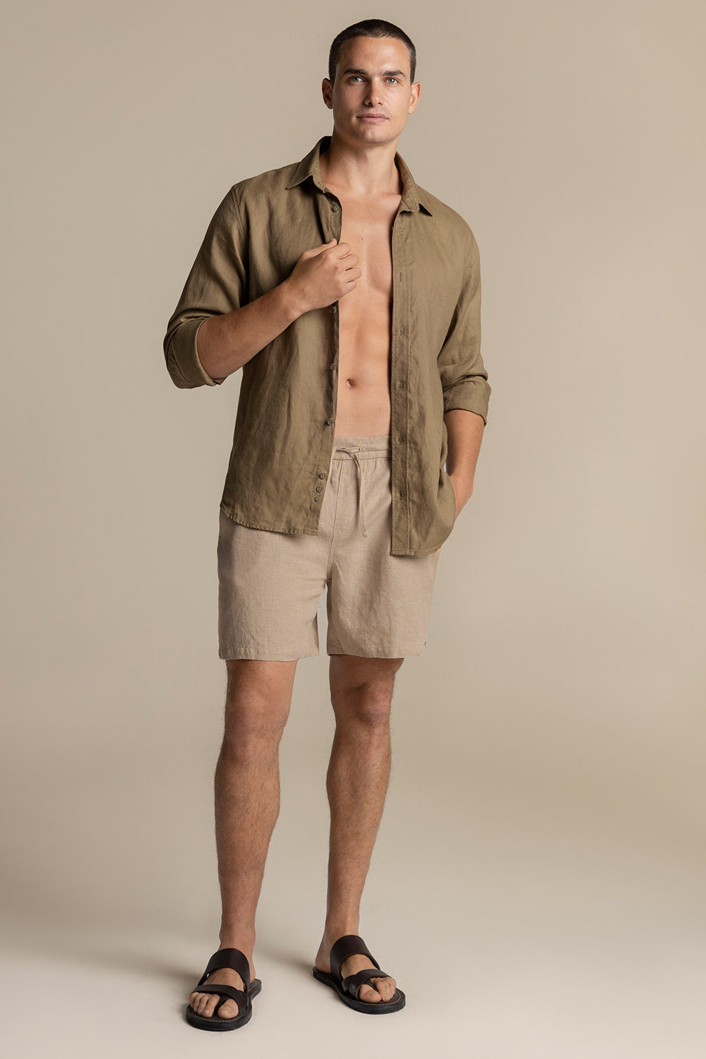 Short en lino khaki. Relaxed fit, bolsillos laterales, cintura enresortada con cordón y bolsillo posterior de ribete. Color caqui, Ref. BH66K61