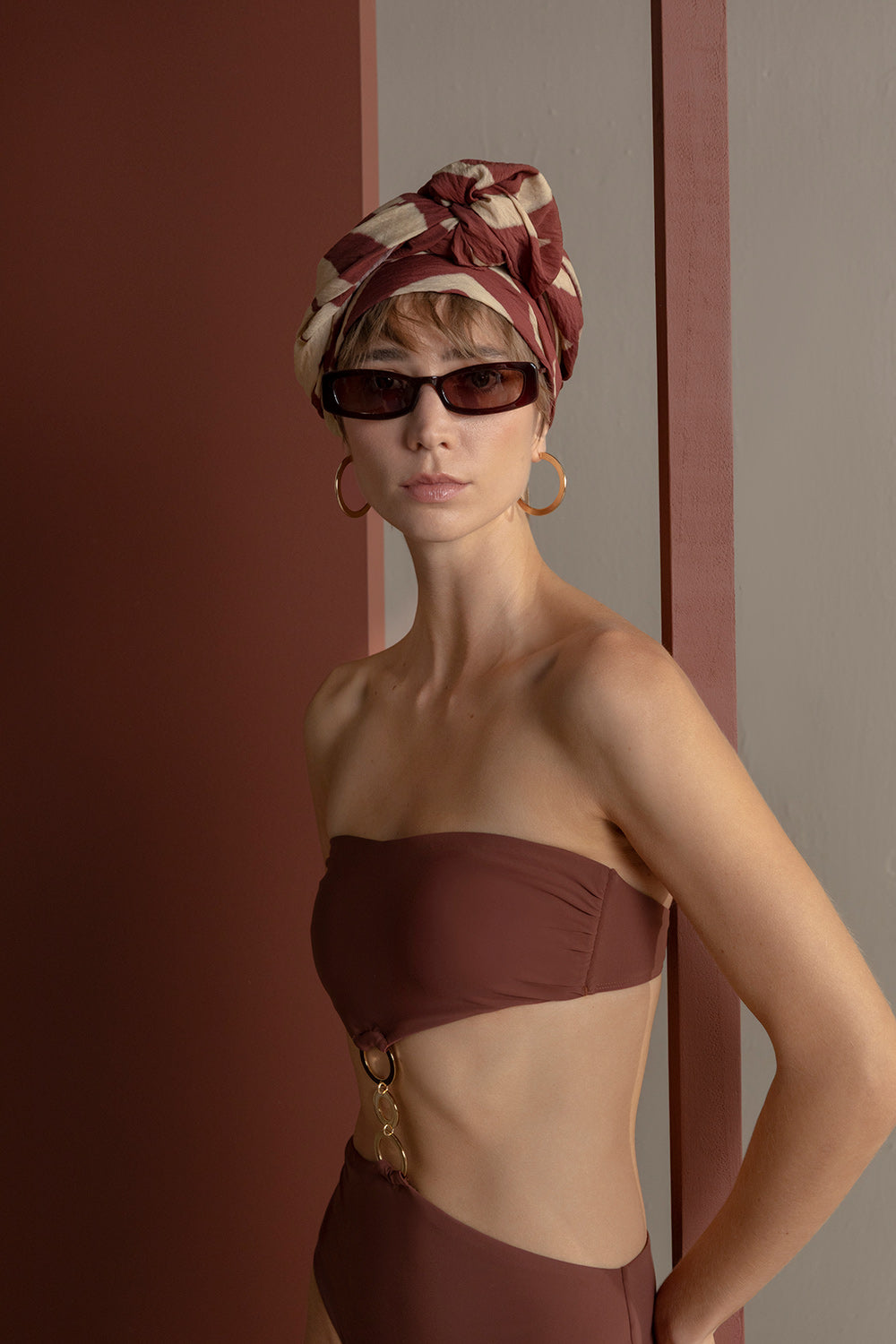Entero trikini en color terracota, con argolla dorada en centro, con elástico de silicona en contorno para mejor adherencia a la piel, broche ajustable con dos posiciones en espalda, accesorios en baño de oro para evitar oxidación y tela con protección uv. Color terracota, Ref. 0E13T53