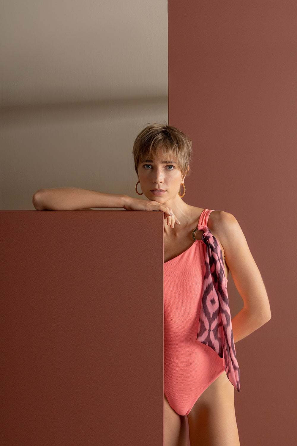 Entero un hombro con textura en color salmón, argolla dorada con Pañoleta en contraste, accesorios en baño de oro para evitar oxidación copas removibles y tela con protección uv. Color salmón, Ref. 0E15S53
