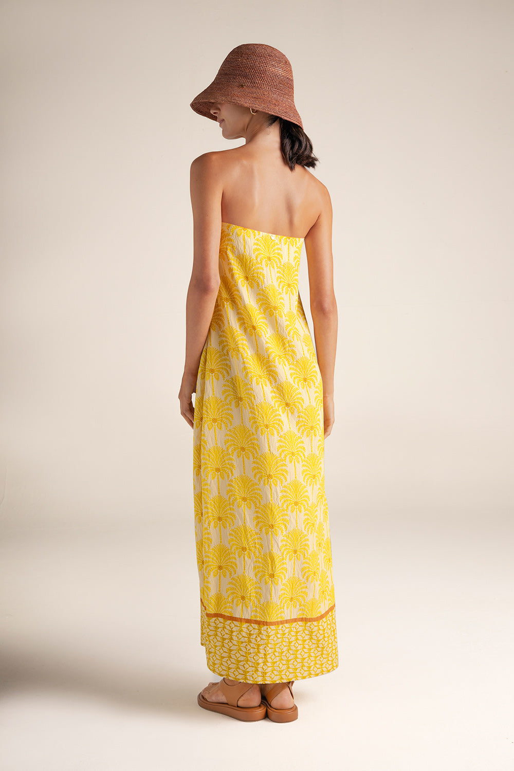 Vestido midi bandeau en tela estampada de palmeras, cierre invisible en el costado izquierdo, con forro tipo top y elástico para un mejor ajuste y moneda en baño de oro grabada con la ''t'', detalle distintivo de la marca. Color estampado amarillo / marfil, Ref. 0F67062