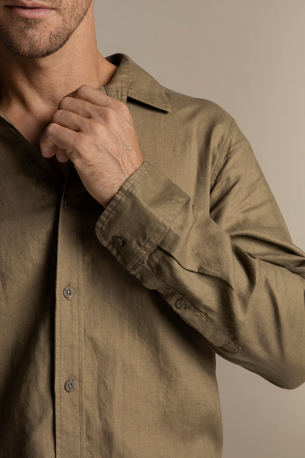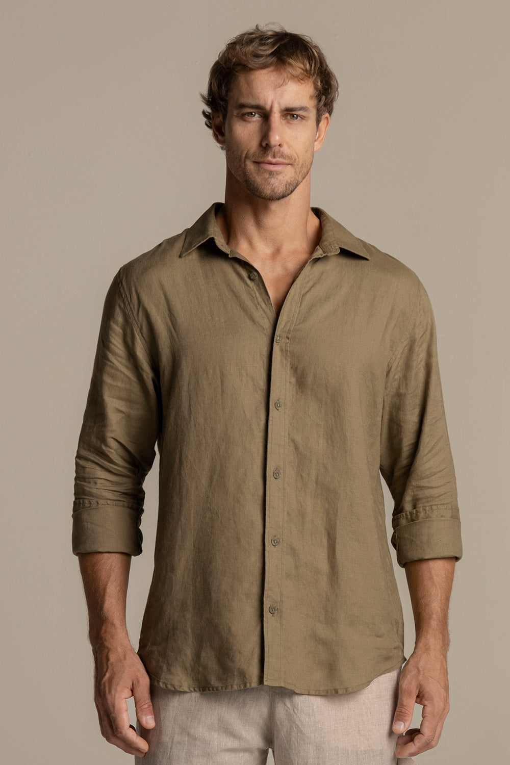 Camisa Bora Bora en lino verde oliva. Manga larga, classic fit, cuello clásico y tabla en espalda. Color verde oliva, Ref. SH55V61