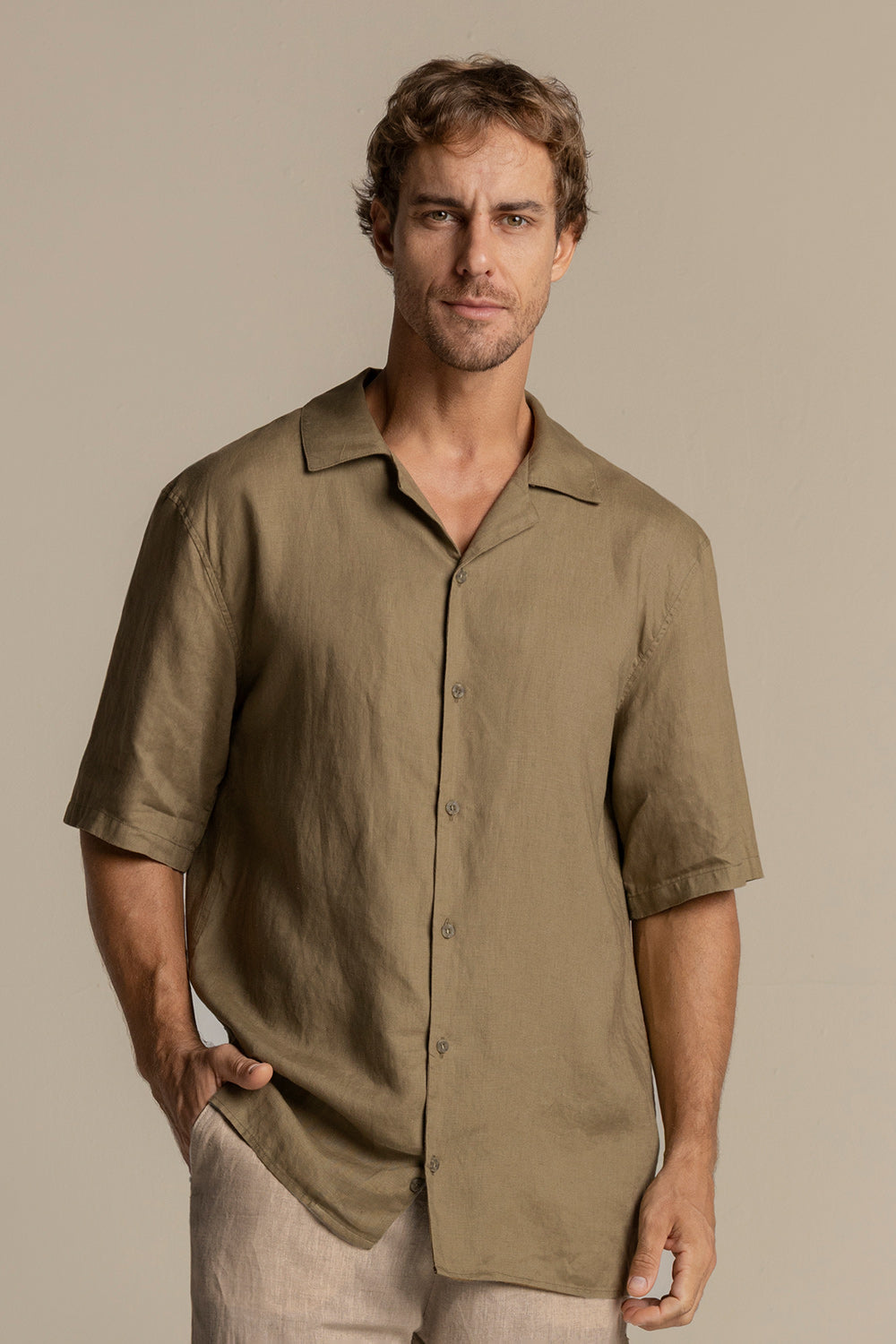 Camisa Ibiza en lino verde oliva. Manga corta, relaxed fit y cuello bowling. Color verde oliva, Ref. SH56V61