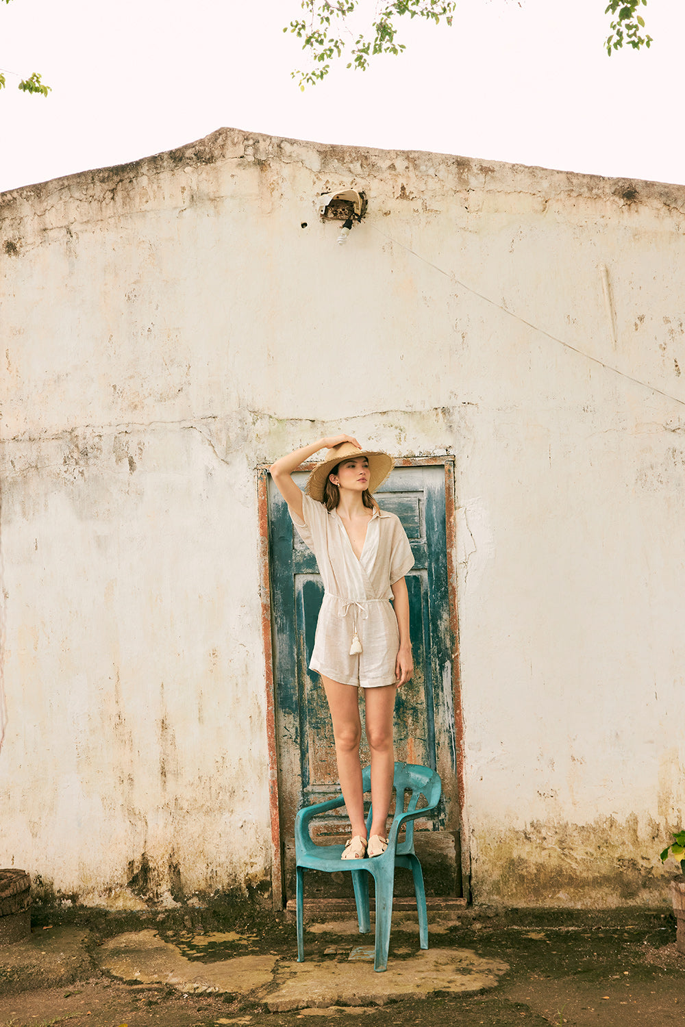 Enterizo corto en lino, escote profundo cruzado, manga corta, silueta amplia, cintura con jareta, elástico interno y tira para amarrar que permite un ajuste a medida, punteras y moneda grabada con la ''t'' en baño de oro y detalle de borlas en los extremos de la tira de ajuste. Color caqui / blanco, Ref. 0A31062