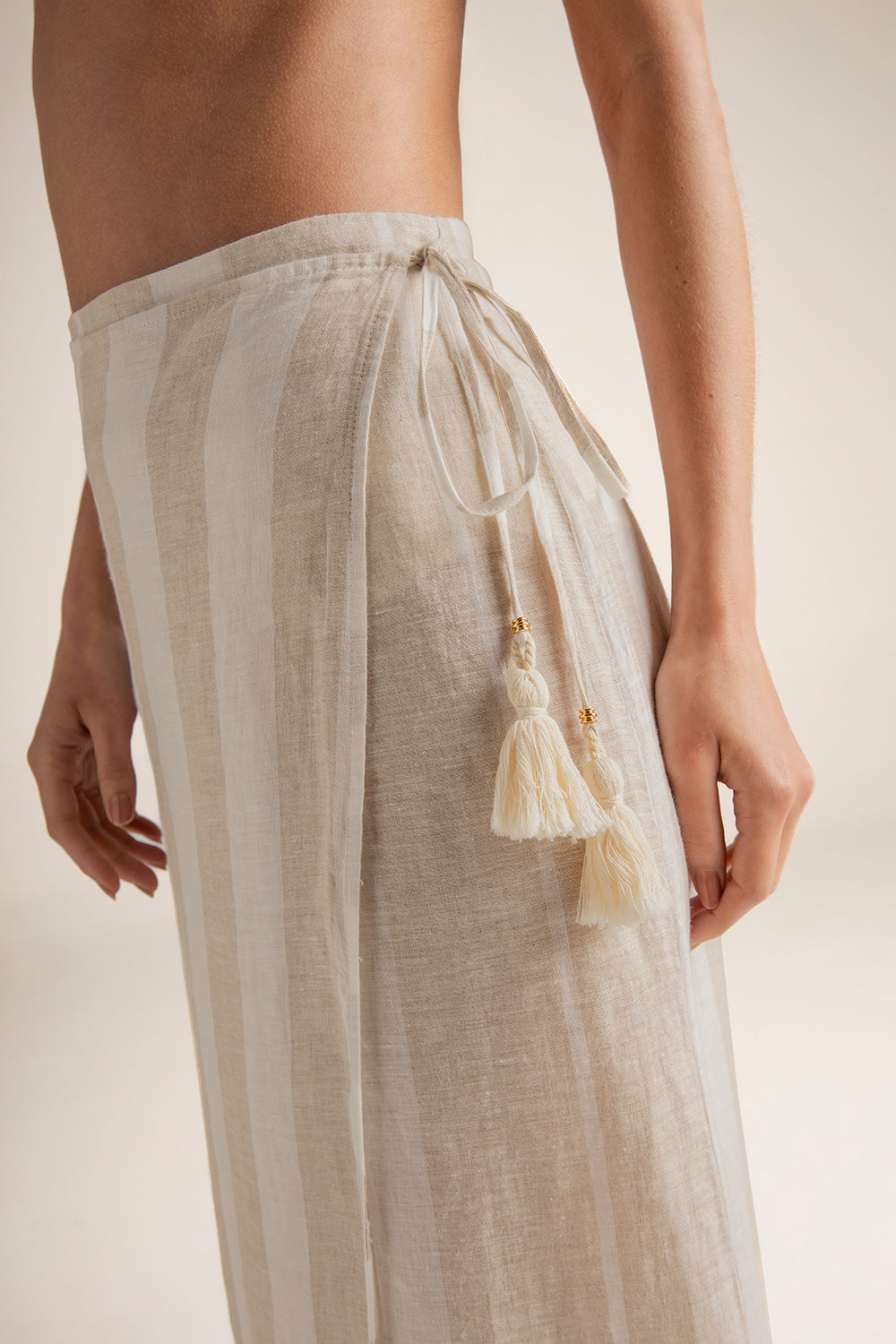 Falda pareo larga en lino, cruzada al frente con tira ajustable y botones internos, recogido con elástico en la parte posterior para un mejor ajuste al cuerpo, punteras y moneda grabada con la ''t'' en baño de oro y detalle de borlas en los extremos de la tira de ajuste. Color caqui / blanco, Ref. 0F58062