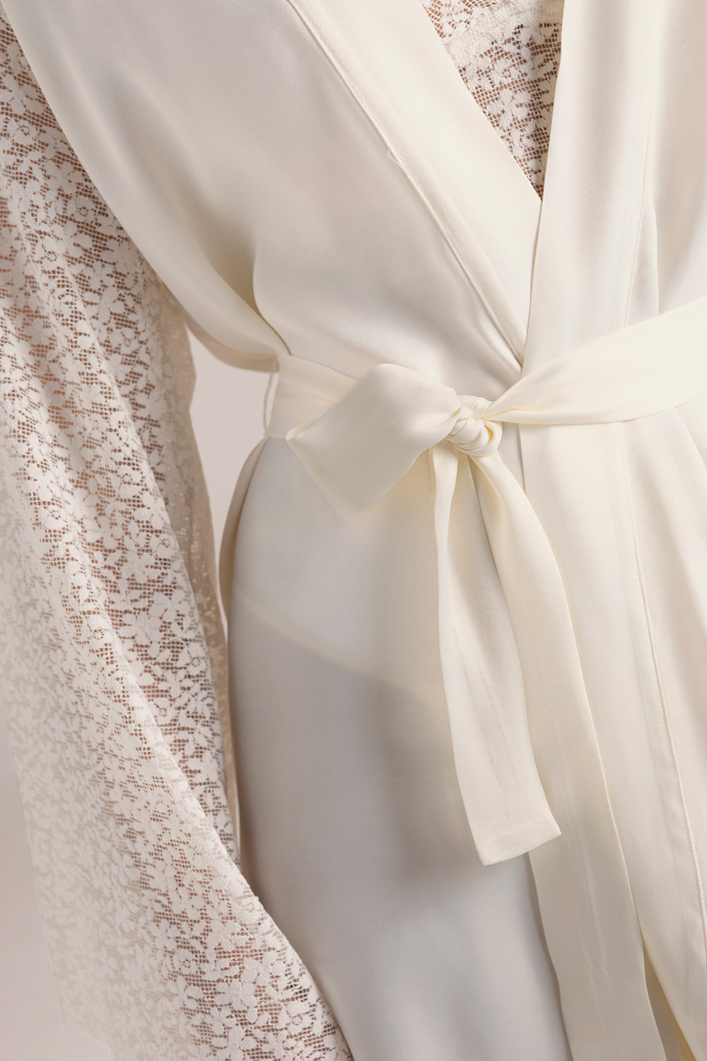 Kimono corto elaborado en viscosa satinada y encaje en mangas, lazo en la cintura para amarrar. Color crudo, Ref. 0524M62