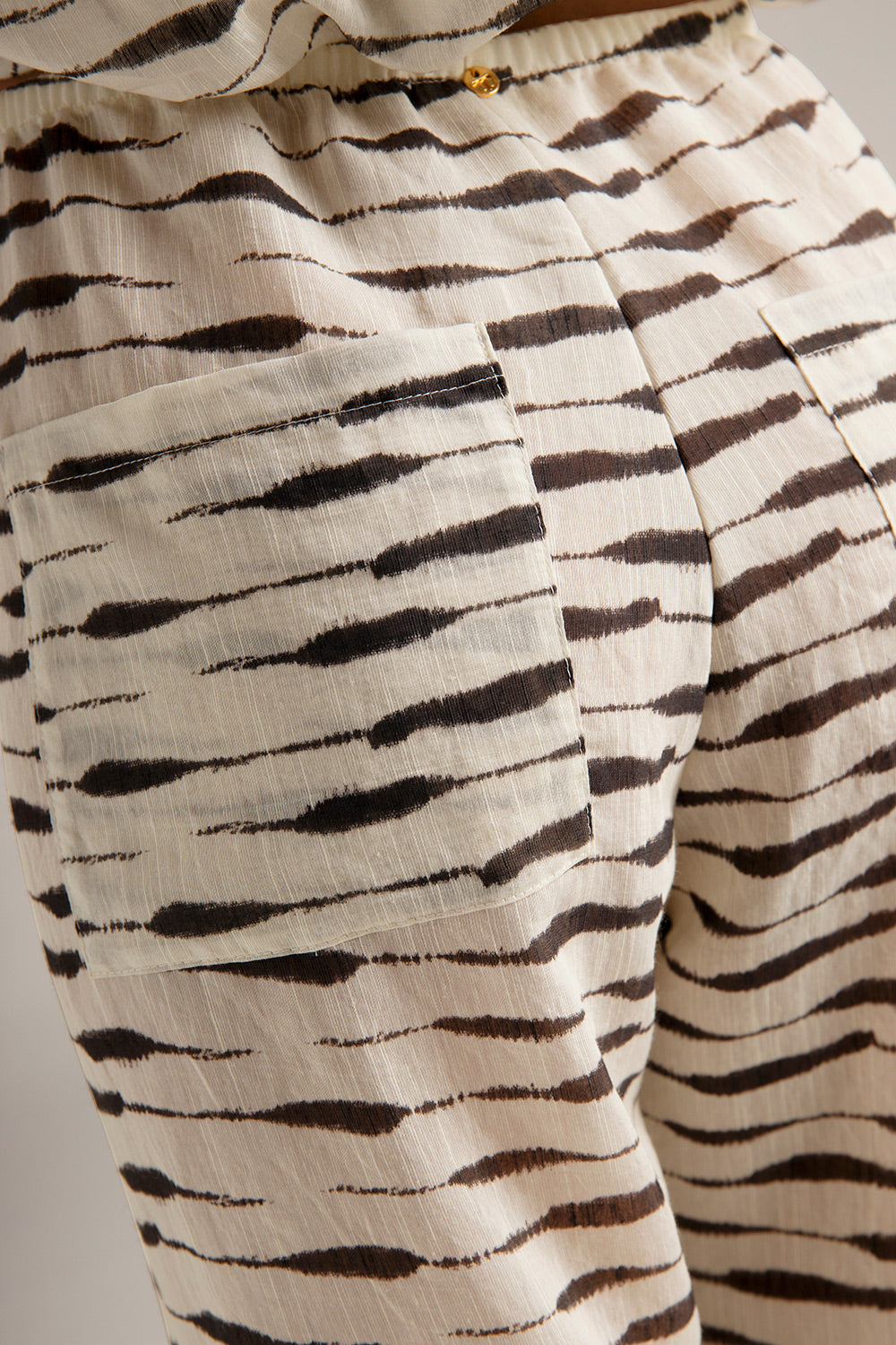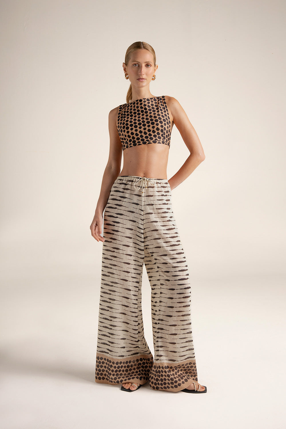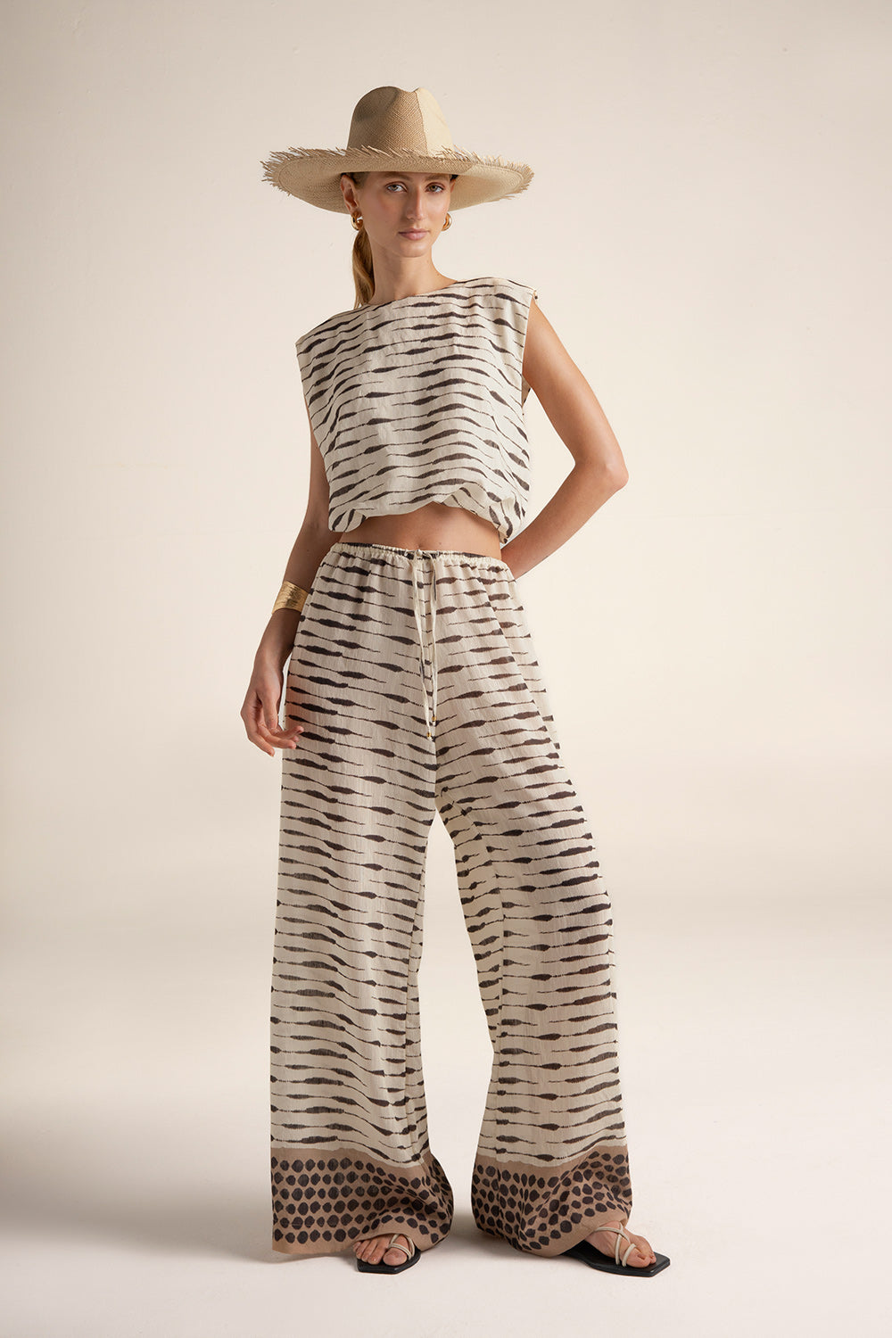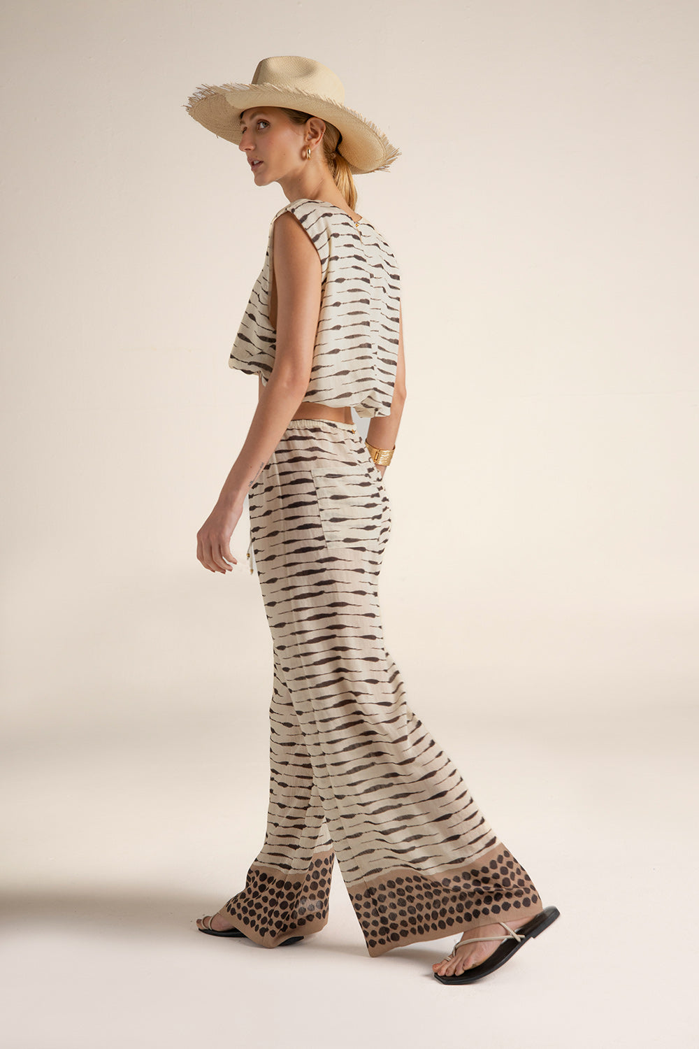 Pantalón en tela estampada de lunares y líneas; bota amplia; cintura con jareta, elástico interno y tira para amarrar que permite un ajuste a medida, punteras y moneda grabada con la ''t'', en baño de oro. Color café / marfil / negro, Ref. 0A46062