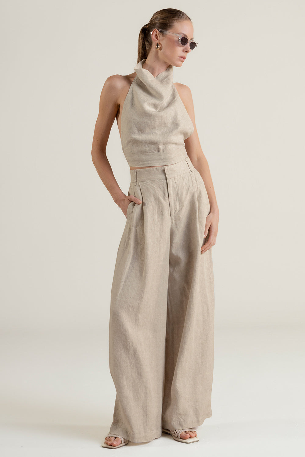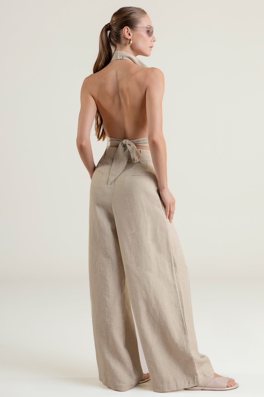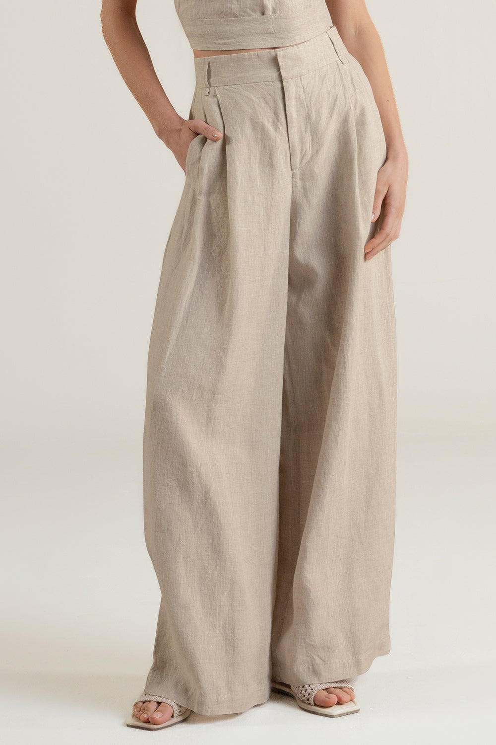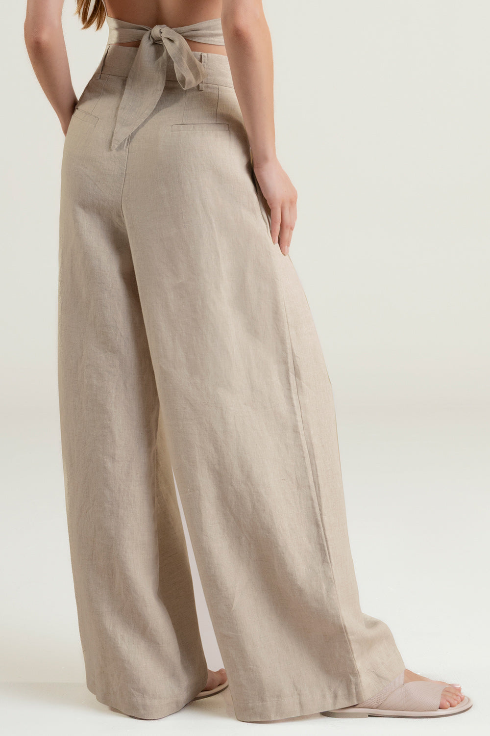 Pantalón con prenses en lino 100% color caqui, cierre frontal, botón y gancho interno, pretina con pasadores, bota amplia, bolsillos laterales, bolsillo de ribete en posterior y detalle moneda con la "t" grabada en baño de oro característica de nuestra marca para evitar oxidación. Color caqui, Ref. 0A51C53