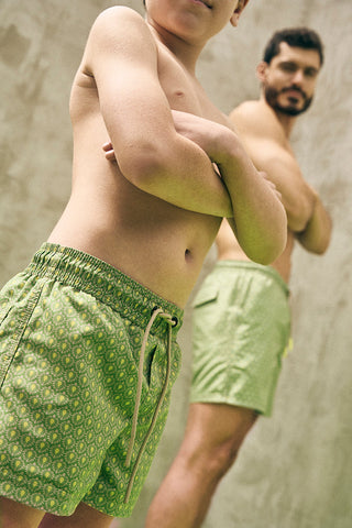Pantaloneta kids estampada, tallas 2-4-6-8-10-12 con elástico en cintura y cordón pardo con punteras en caucho, ojaletes negro mate en zamack y bolsillo de parche Color Verde/Amarillo Ref. KH86P41-KH86G41
