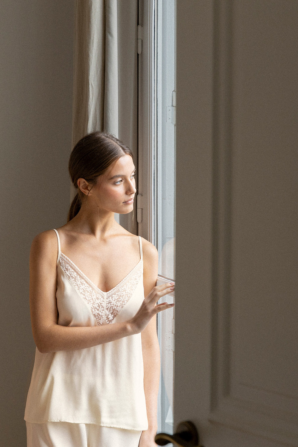 Pijama short elaborada en viscosa satinada, camisa de tiras con escote profundo en encaje, cargaderas ajustables, short clásico bota recta. Color crudo, Ref. 0519M62