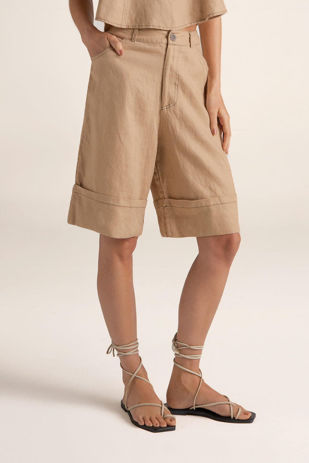 Short bermuda en lino, con costuras negras en contraste; tiro alto, silueta recta; bolsillos delanteros redondeados a la cadera y un bolsillo de parche posterior; con cierre y botón con grabado ''touché'', pasadores en pretina, detalle de ruedo ancho y moneda en baño de oro grabada con la ''t'', detalle distintivo de la marca. Color caqui, Ref. 0A13C62