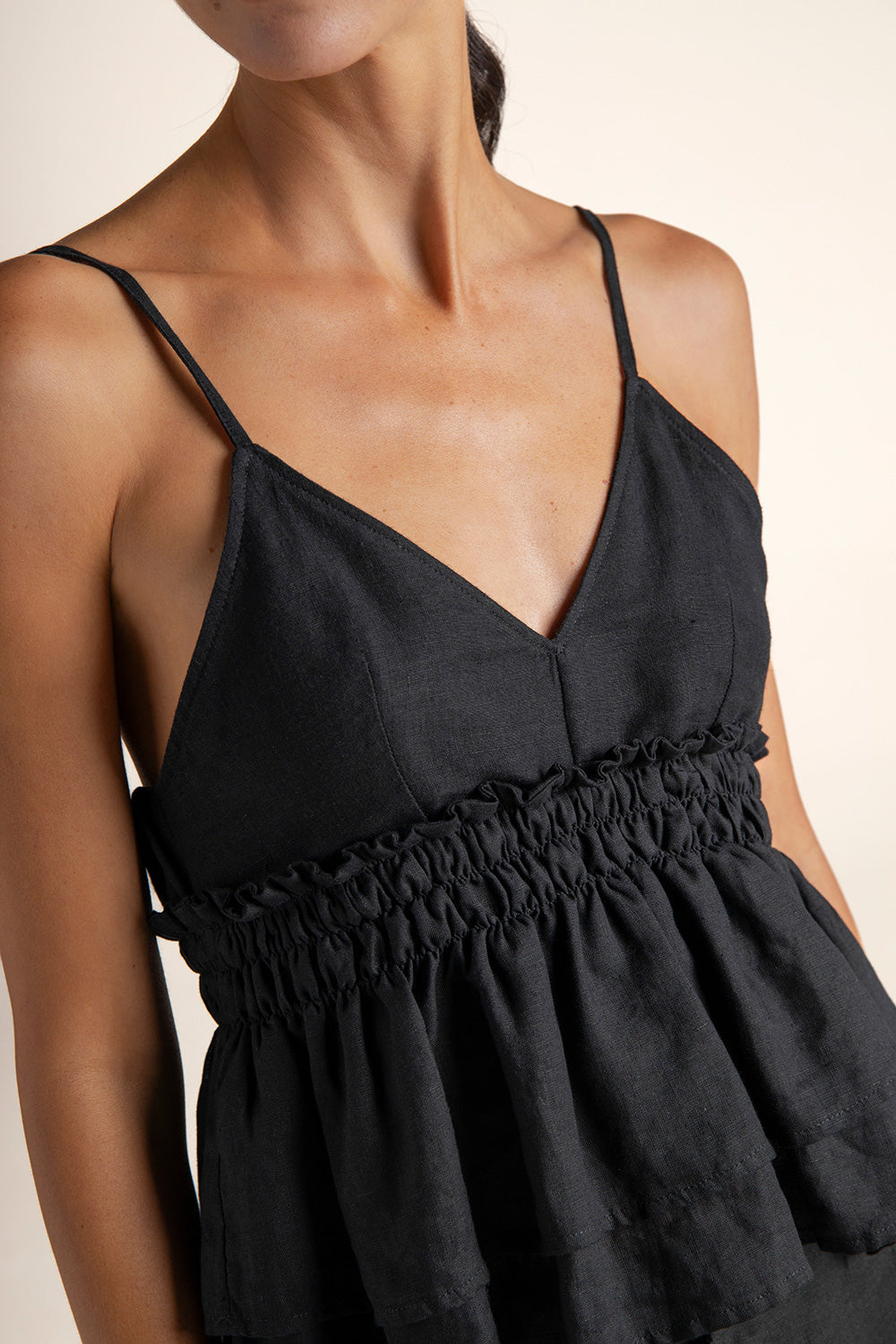 Top corto en lino, cintura en nido de abeja; cargaderas delgadas para amarrar en la espalda que permiten un mejor ajuste y moneda en baño de oro grabada con la ''t'', como detalle distintivo de la marca. Color negro, Ref. 0A25N62